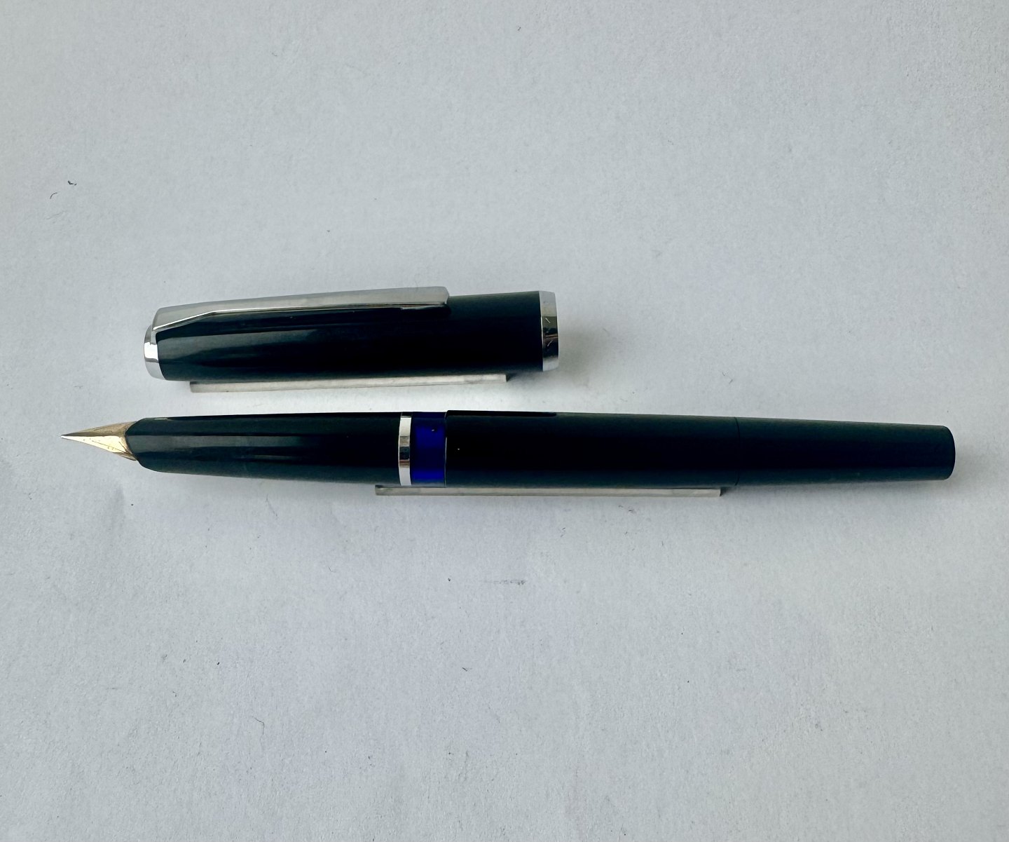 Vintage back Pelikan Silvexa 20 fountain pen with chrome-plated parts. Cartridge filling system. Made in Germany in the mid-1960s. A new refill must be inserted before it can write again. Length: 13.4 cm