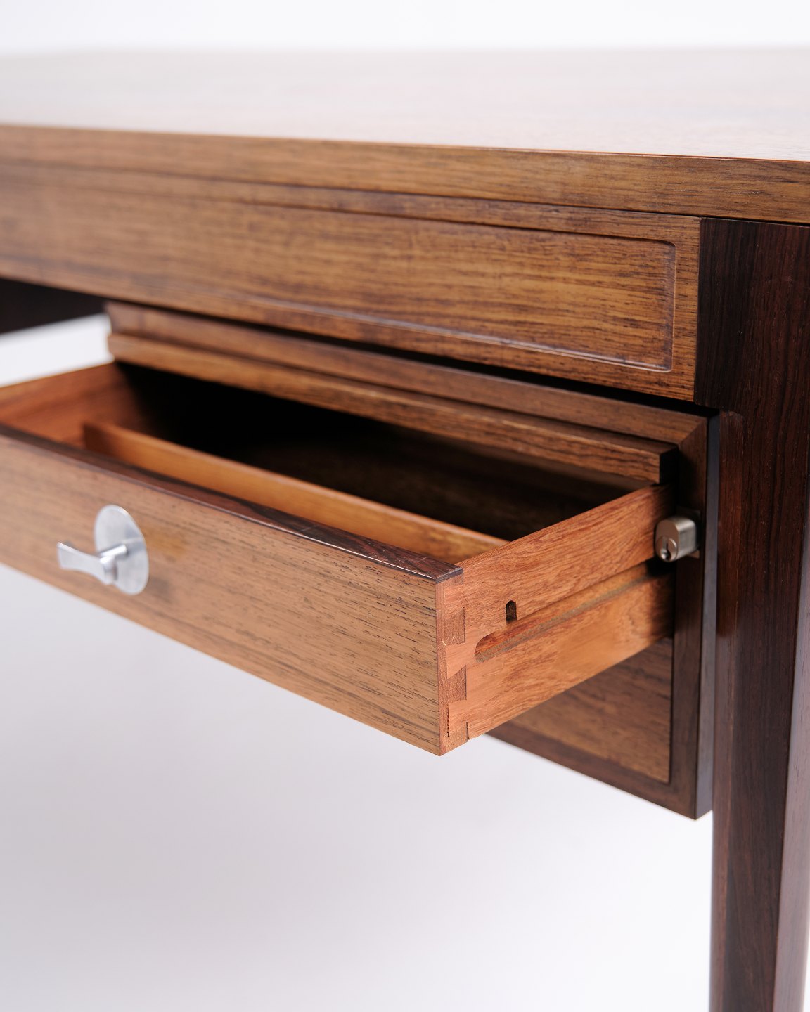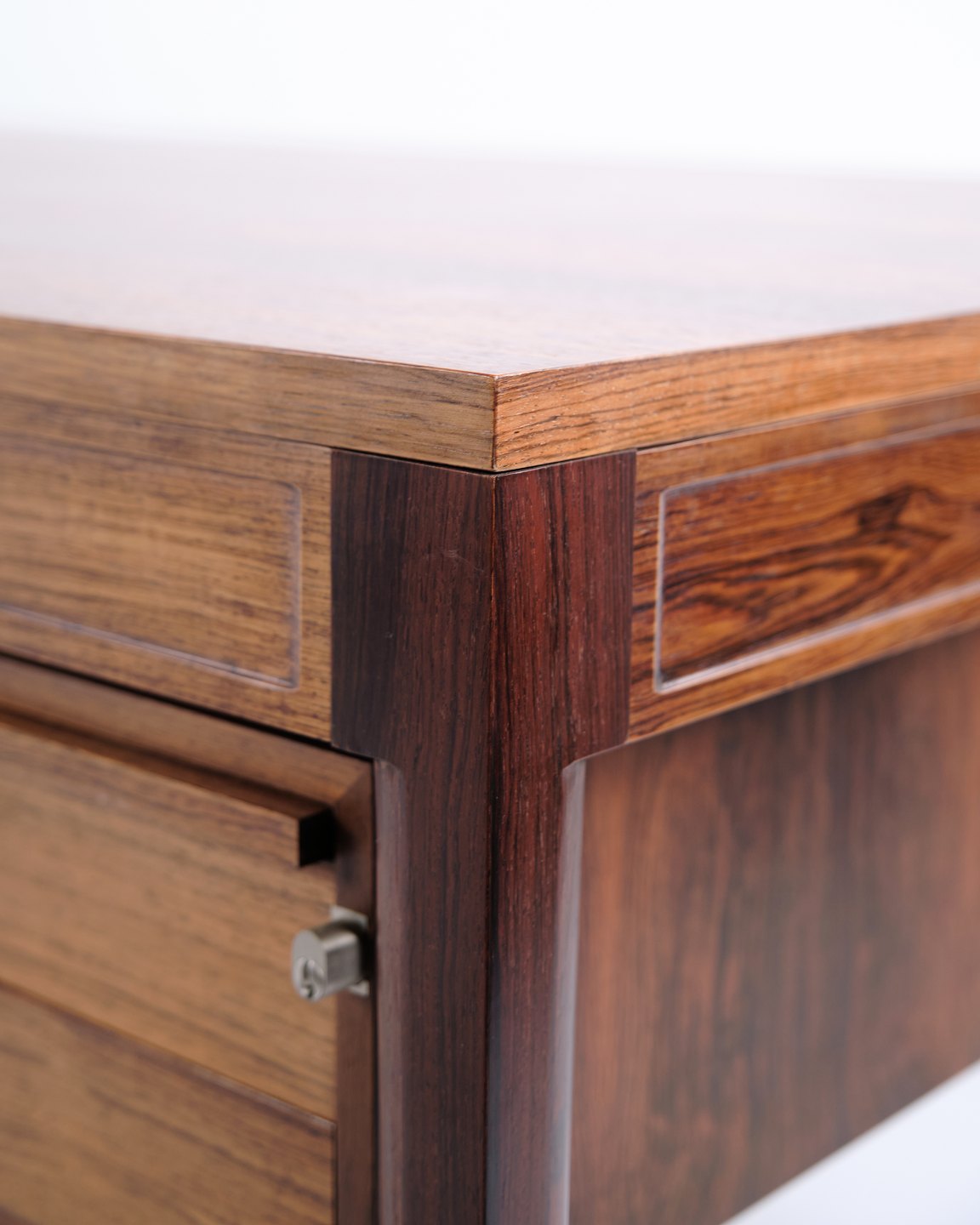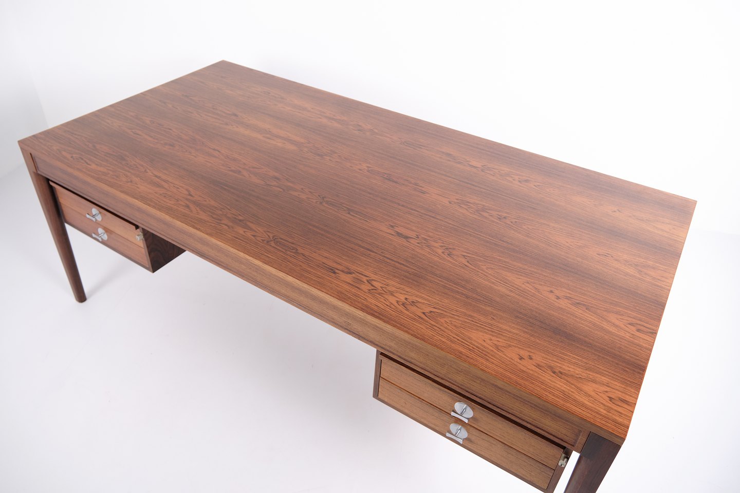 Diplomat desk designed by Finn Juhl for France & Søn around 1961. Made in rosewood with a rectangular top and two suspended drawer units. Each unit includes an extending writing surface and two drawers with brushed steel handles. A highly sought-after Finn Juhl design with distinctive lines and premium materials.