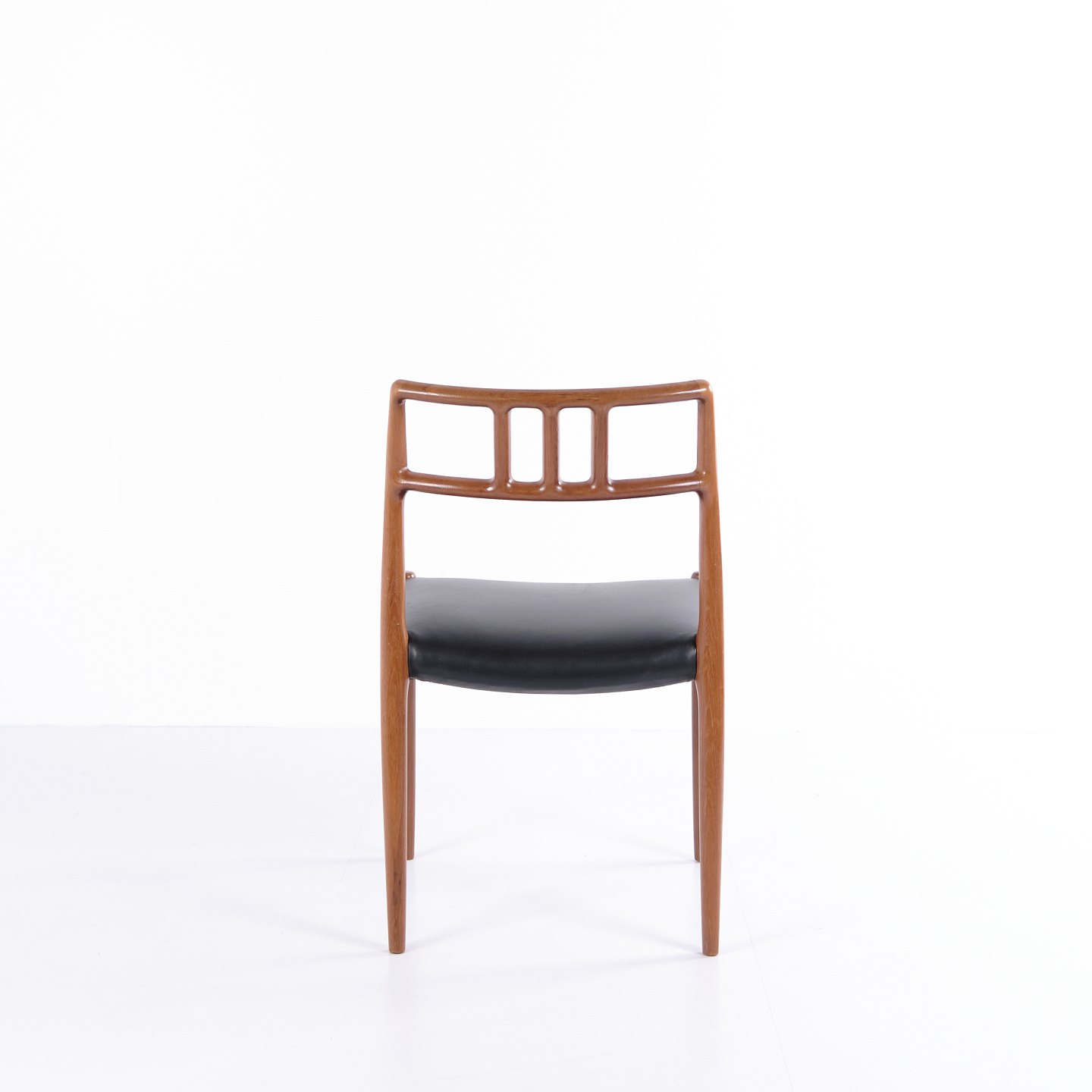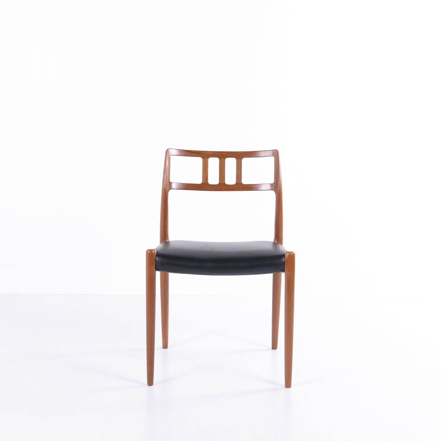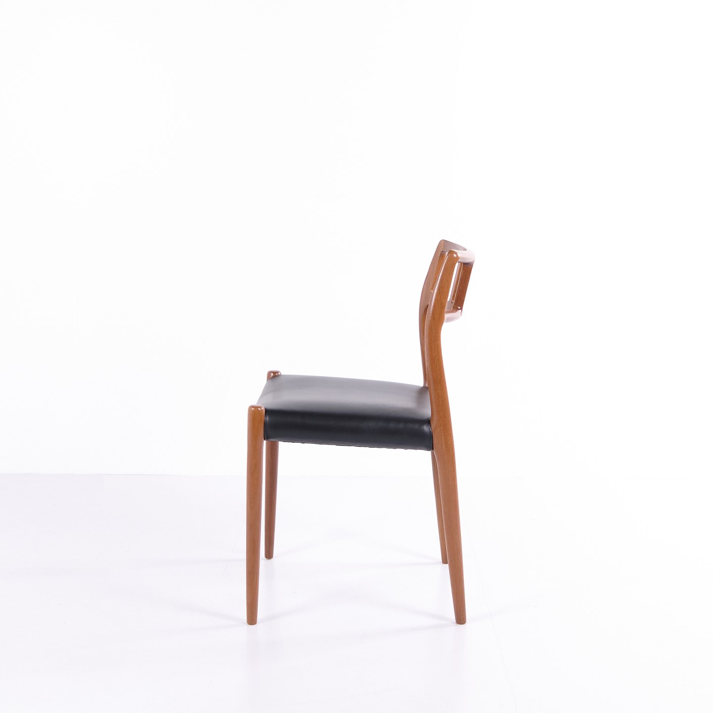 Dining chair model 79, designed by Niels Otto Møller and produced by JL Møllers Møbelfabrik in the 1960s. Made in teak with a black leather seat. A classic Møller design known for craftsmanship and elegant form.