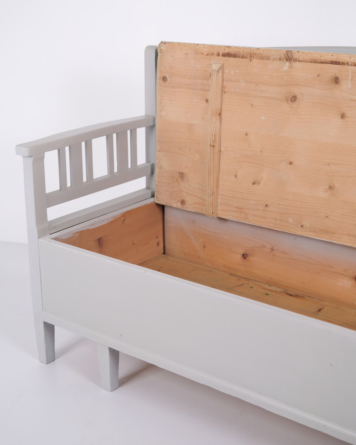 Swedish bench from the 1860s, made in pine and later painted grey. A classic Scandinavian piece with decorative painted details and practical storage beneath the seat. Well-preserved antique furniture with characteristic period features.