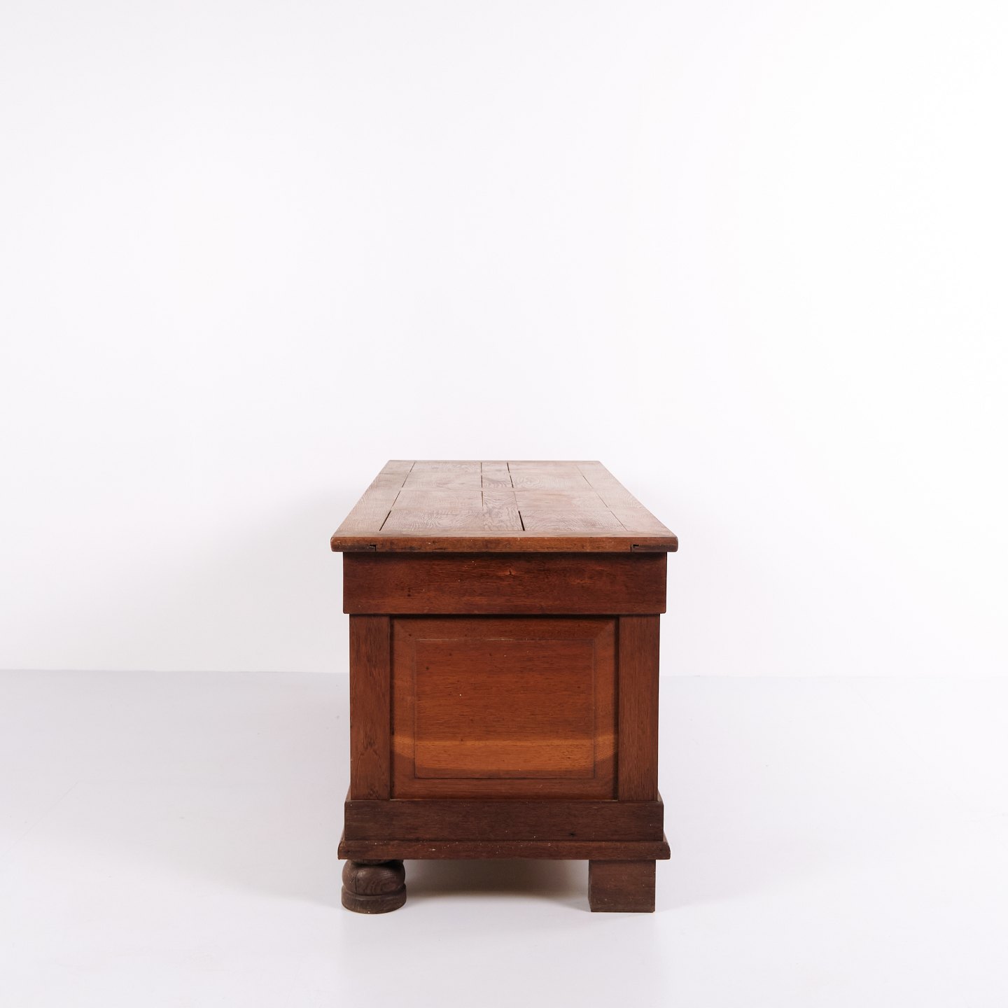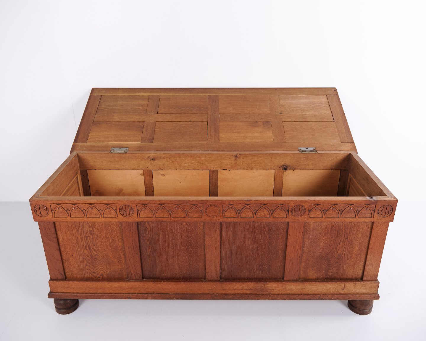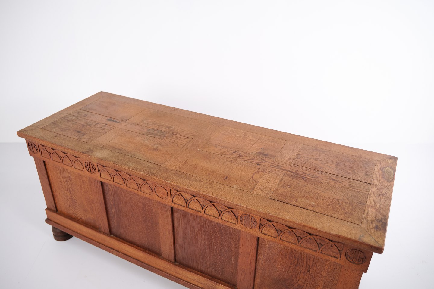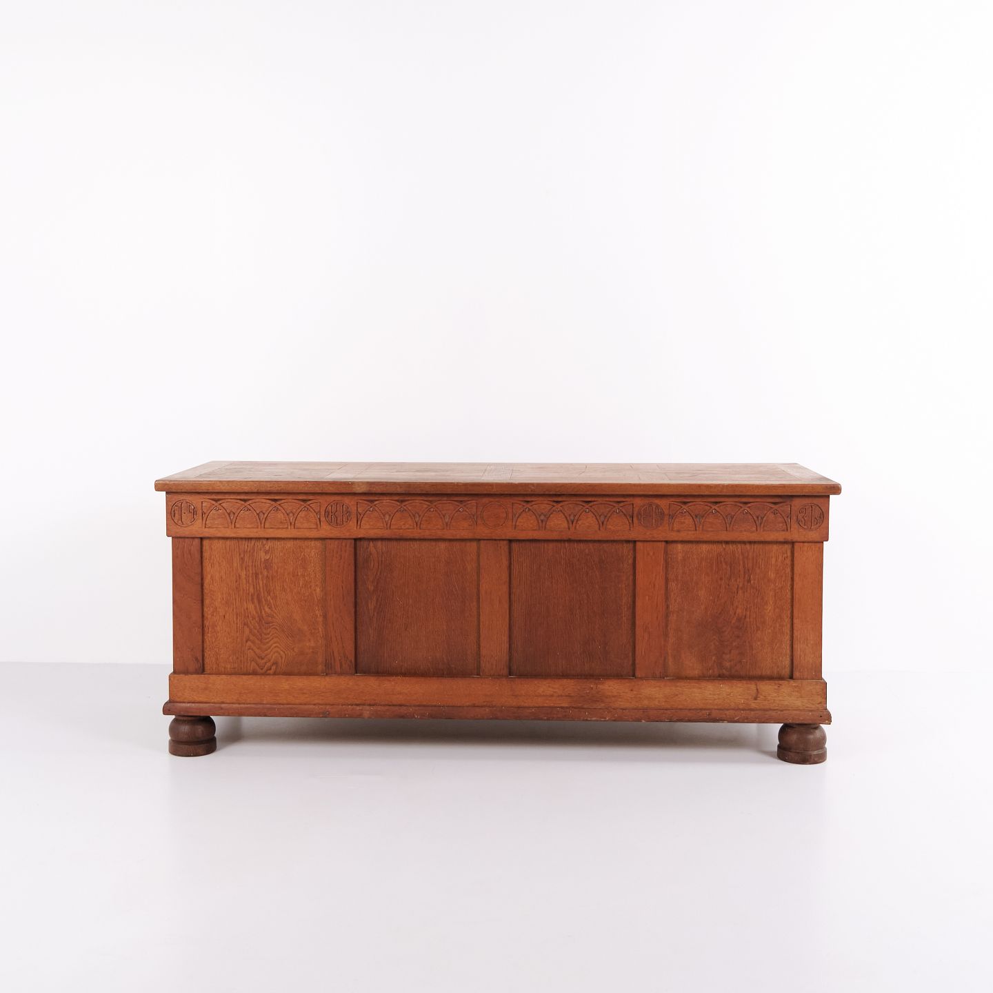 Chest/sideboard from the 1920s, crafted in oak with decorative carved details and round legs. Offers spacious storage and features typical period design. A solid antique piece in very good condition.