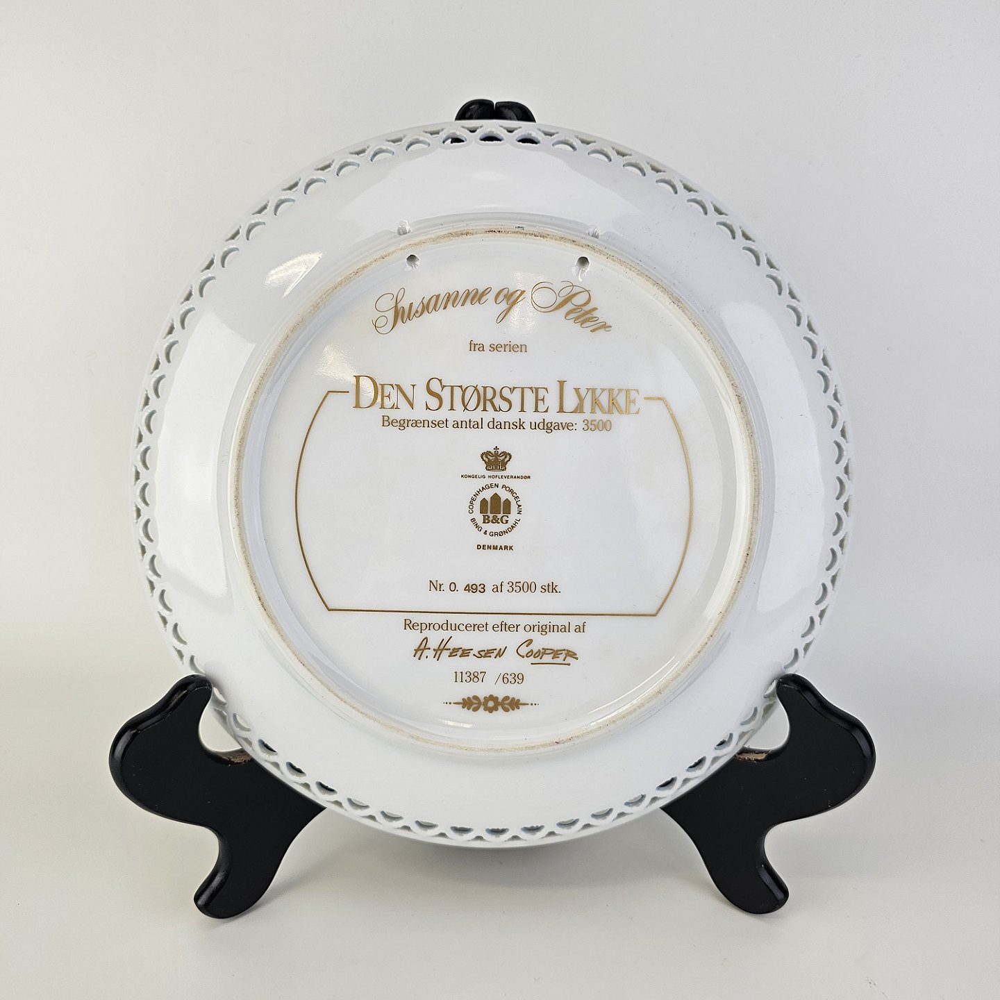 Platten er i porcelæn med overglasur og gennembrudt kant. Den er produceret i begrænset oplag, denne platte er nummer 493 af 3500.