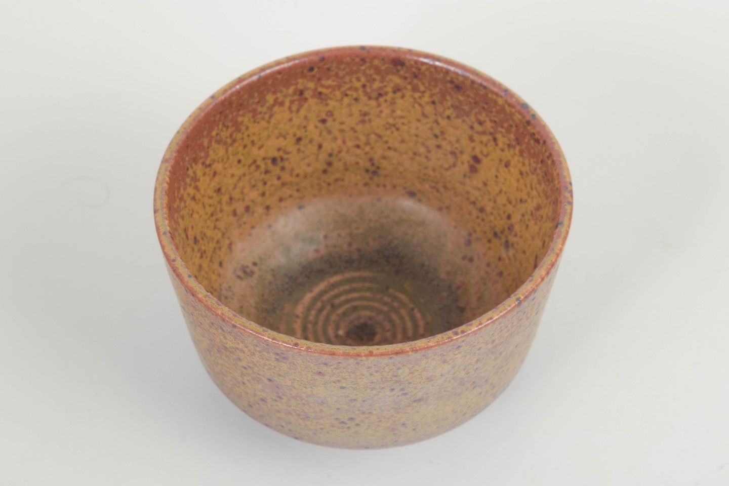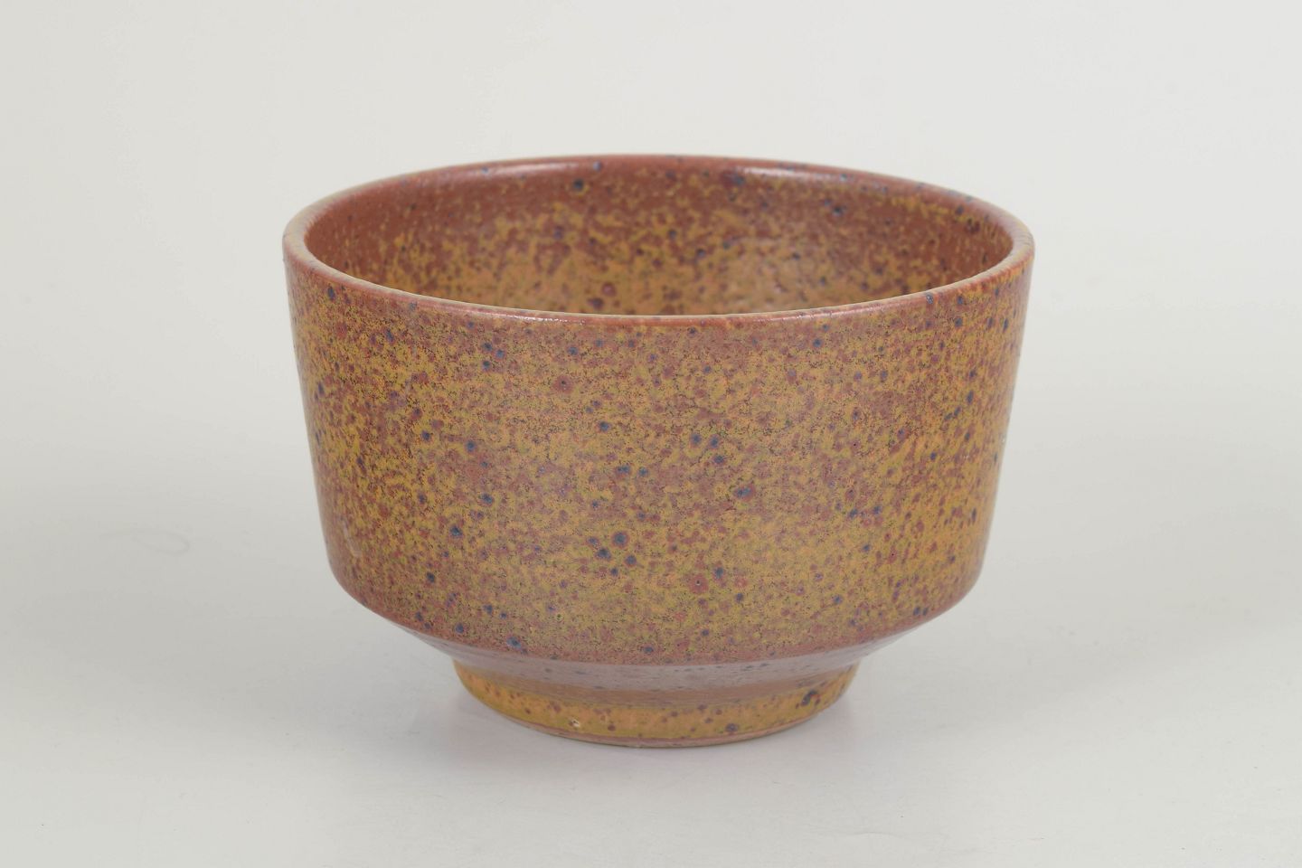 Hand-glazed stoneware bowl in warm brown-yellow tones with a densely speckled surface, characteristic of Starck’s experimental colour and texture work during the period.