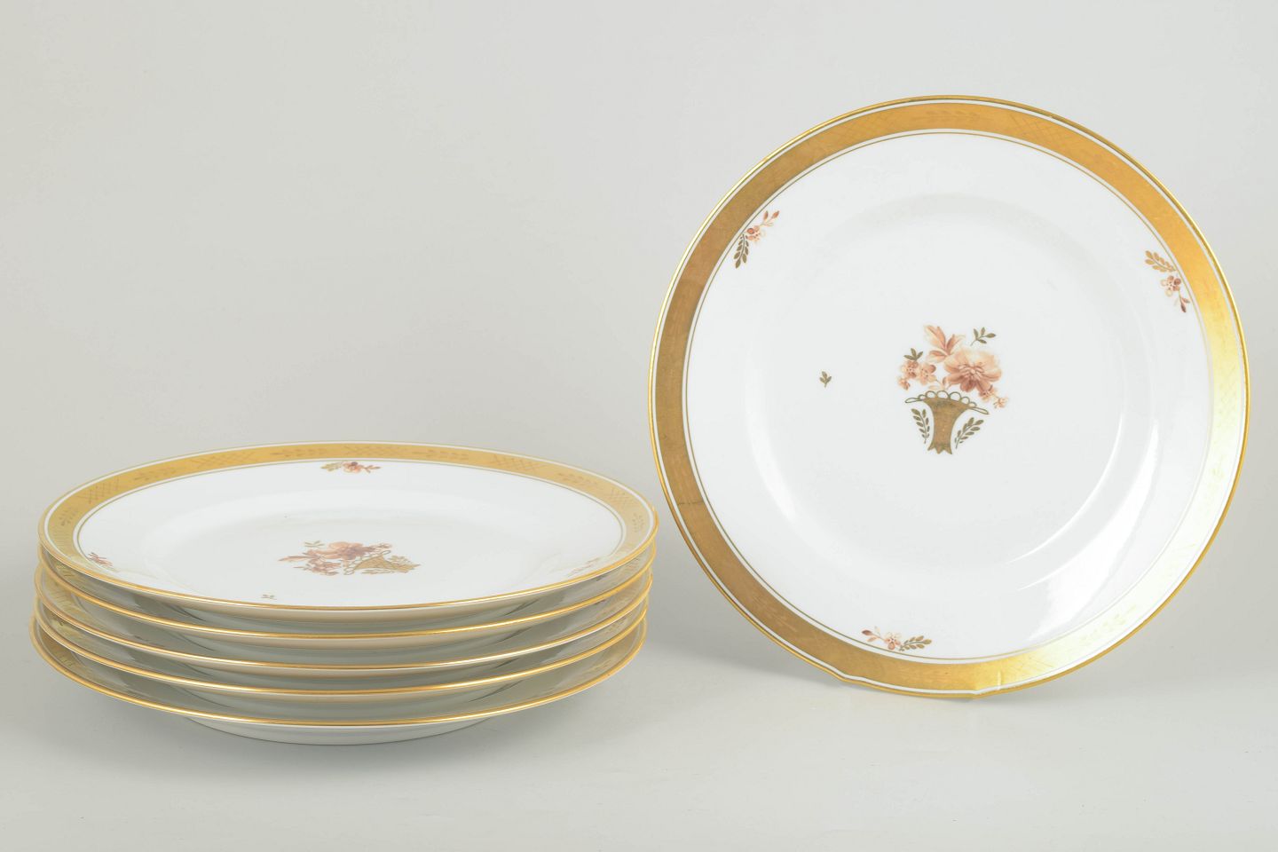 Set of six elegant dinner plates in porcelain from Royal Copenhagen’s “Golden Basket” series, model 595/9586. Classic white porcelain with a wide gilded rim and hand-painted floral basket motif.