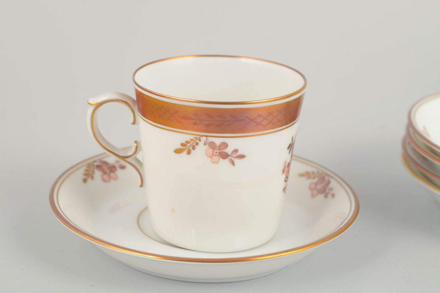 Beautiful set of five demitasse cups with matching saucers from Royal Copenhagen’s “Golden Basket” series, model 595/9093. Executed in porcelain with gilded rims and hand-painted floral decoration.