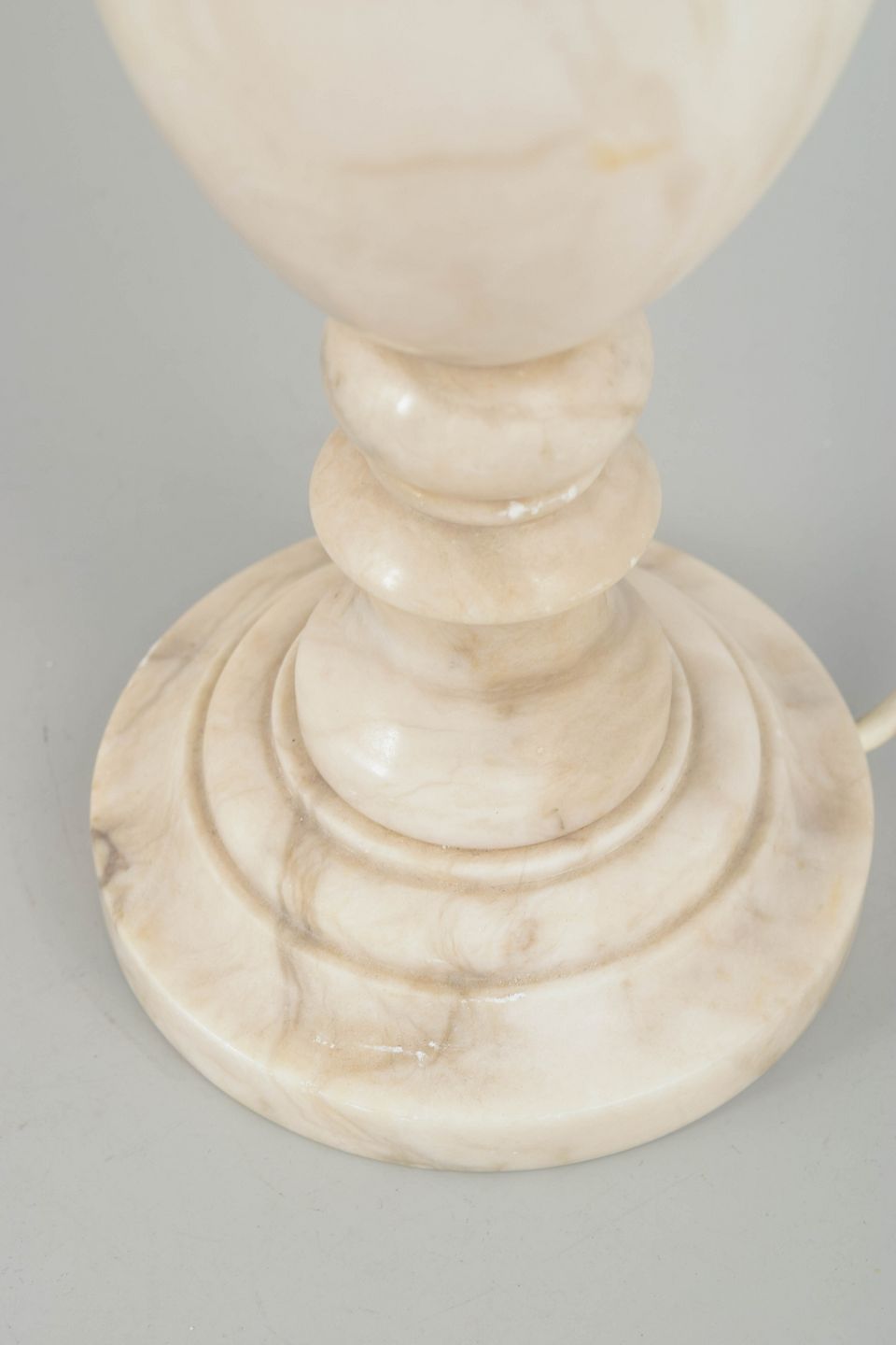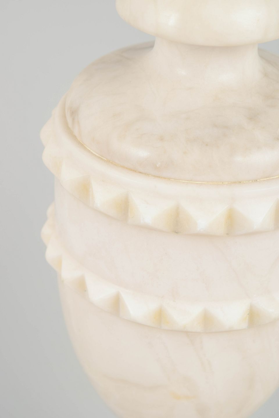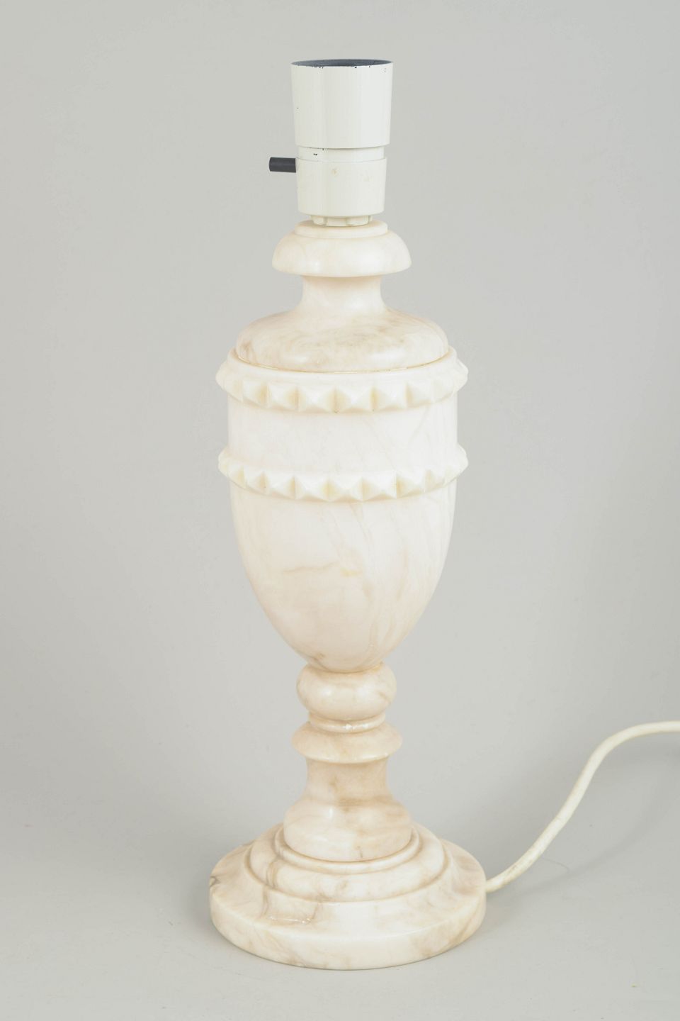 Sculptural table lamp in light marble featuring a decorative band of small carved notches around the upper midsection. The classic urn shape combined with the rounded base creates a soft, harmonious and decorative appearance.