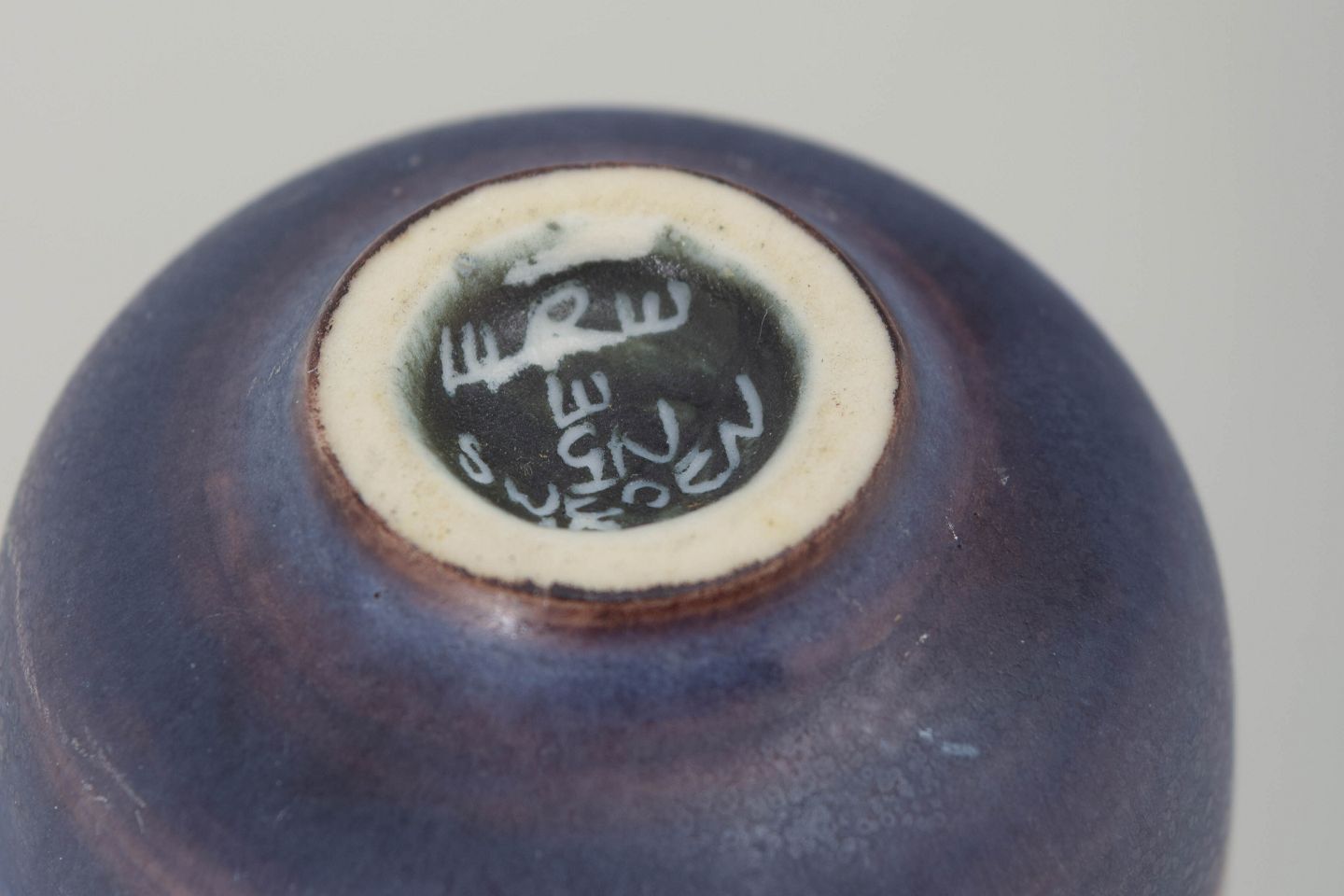 Hand-thrown stoneware miniature vase with characteristic soft striped decoration in violet and cream tones. A refined small form displaying Nylund’s distinctive sense of proportion and tactile surface treatment.