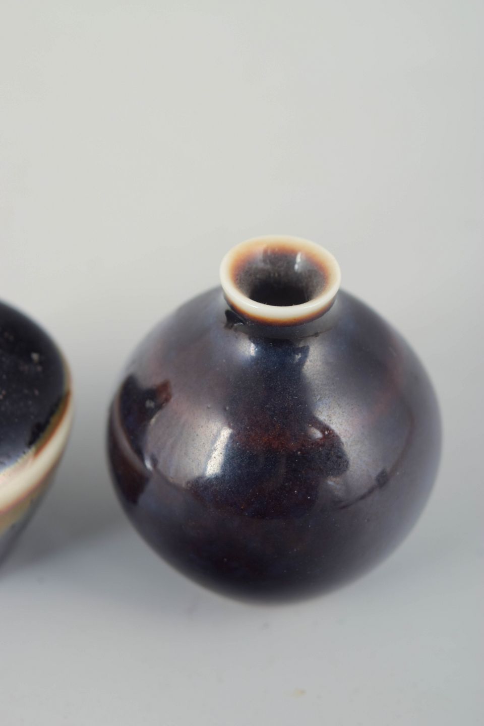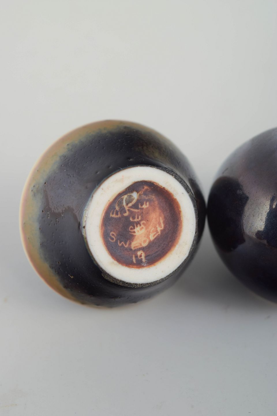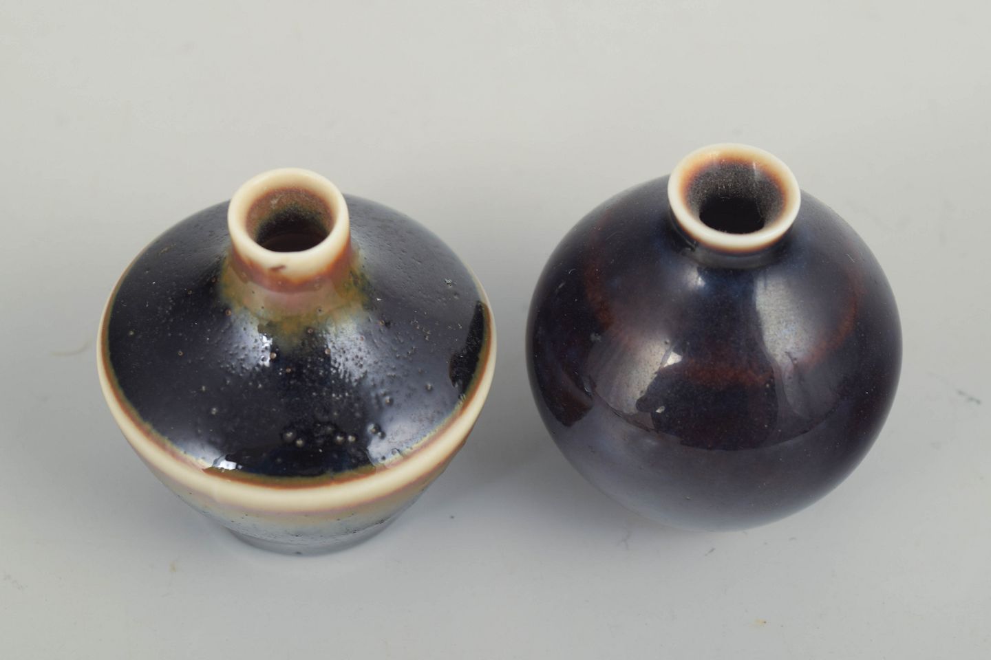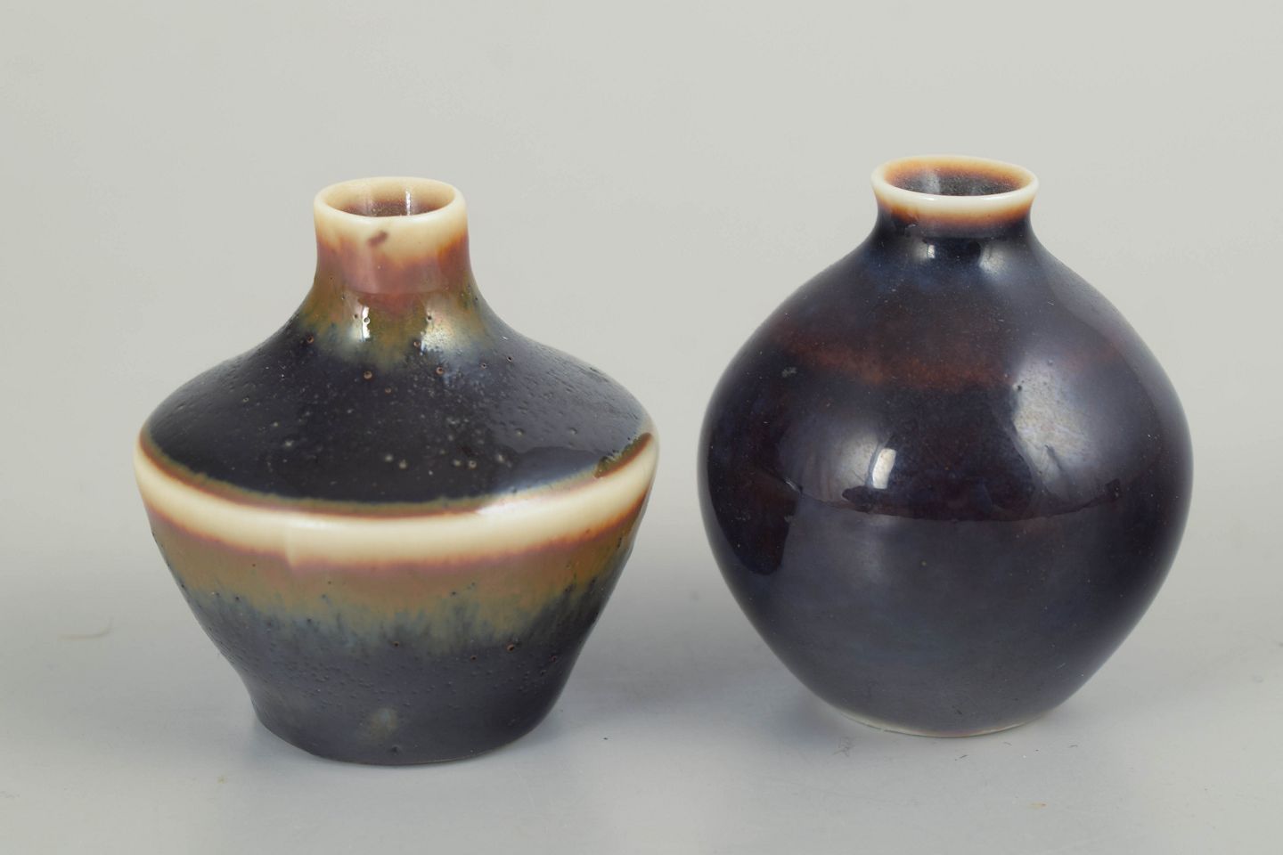 Two wheel-thrown stoneware miniature vases with richly saturated glazes in deep violet and brownish tones, both showing Stålhane’s refined sense of proportion and surface expression.