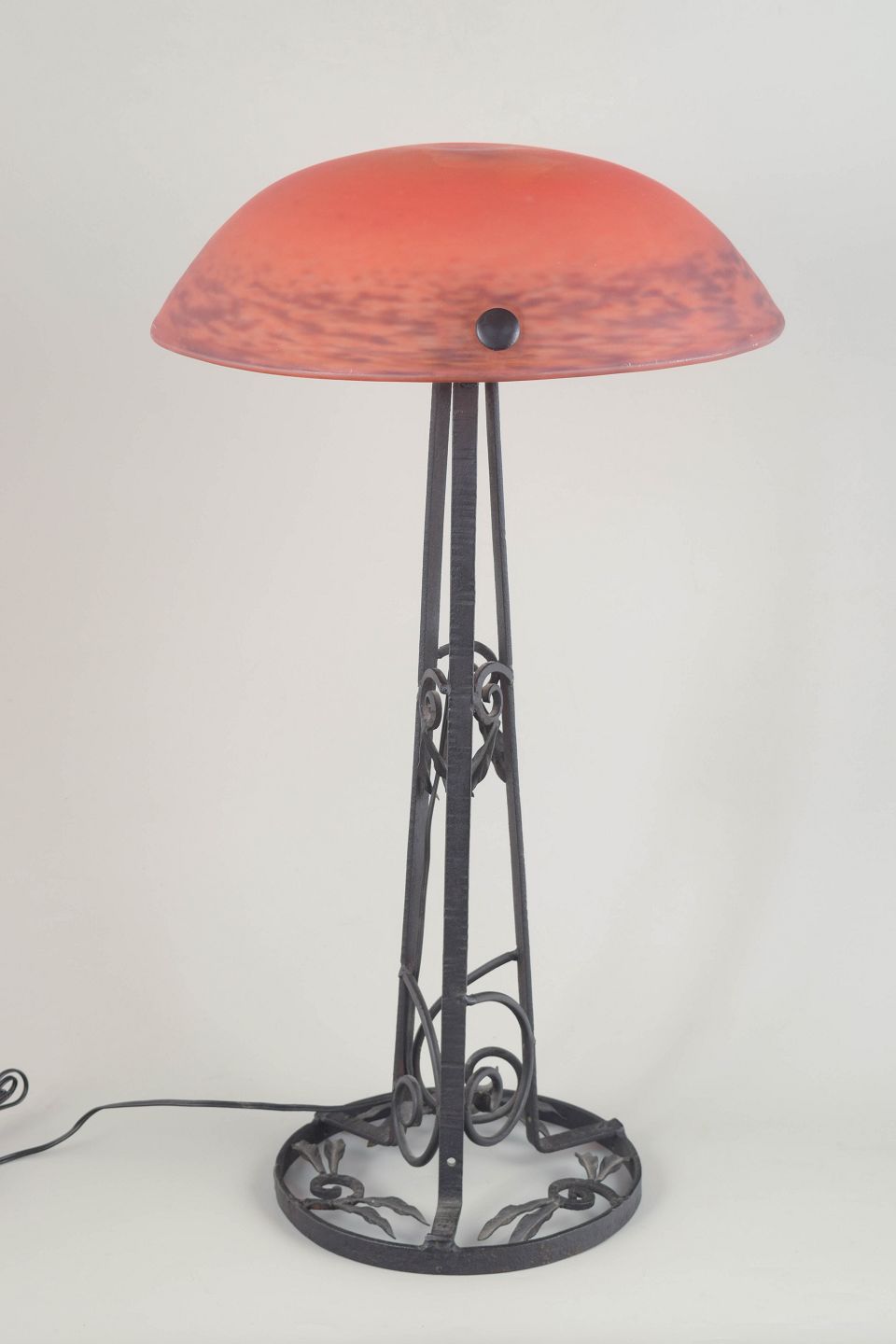 Decorative table lamp in the Art Nouveau style with a cast-iron base and a handmade art glass shade in warm, reddish tones. The organic silhouette and swirling iron tendrils create an elegant, sculptural presence.