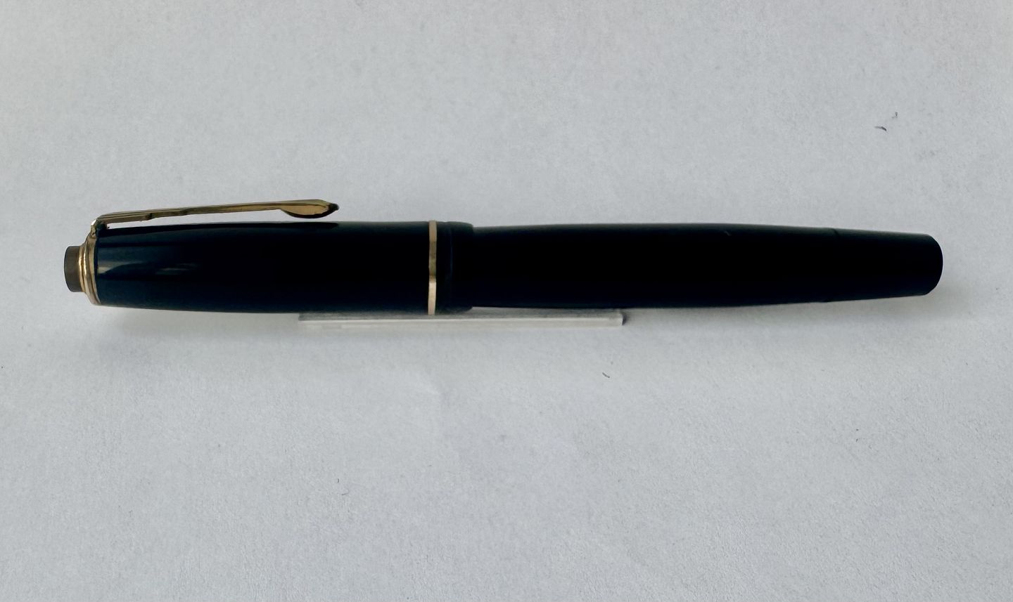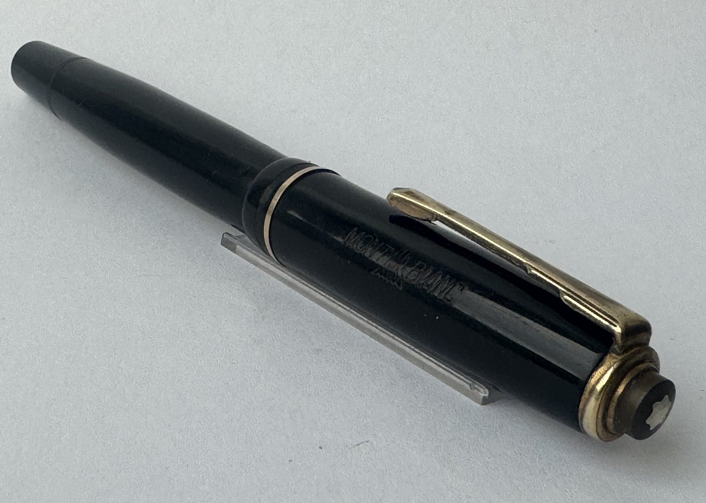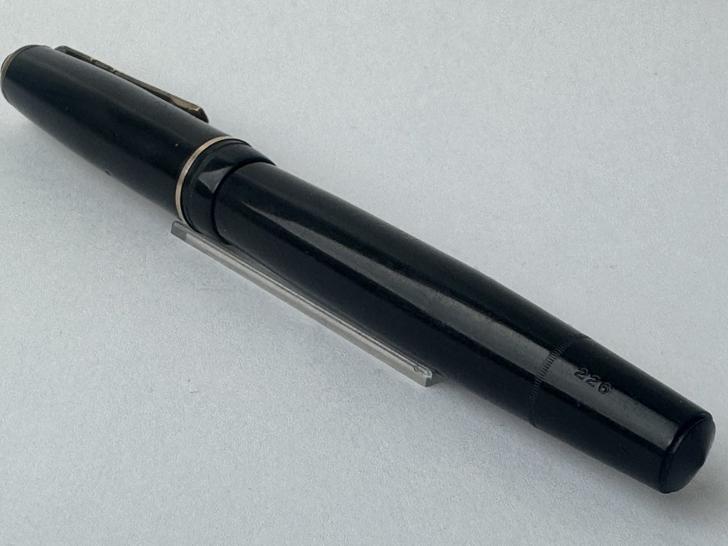 Black Montblanc no. 226 fountain pen. Push button filler. Made in Denmark from the late 1940s. Missing a cap belt on the cap. Otherwise in good condition without damage or repairs. The cap is marked with MONTBLANC the small black bottom screw with the model number 226. A new rubber sack must be inserted before it can absorb ink and write again.