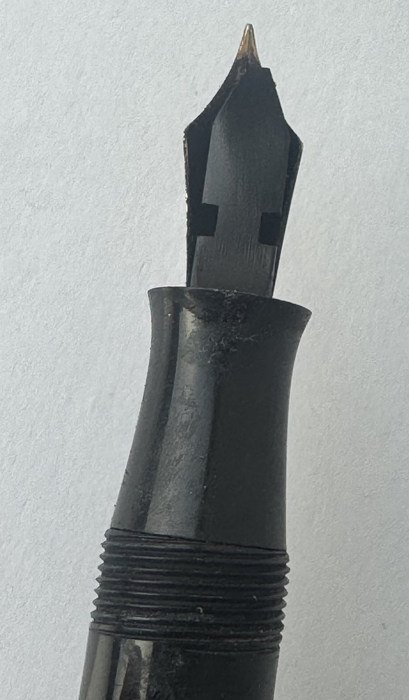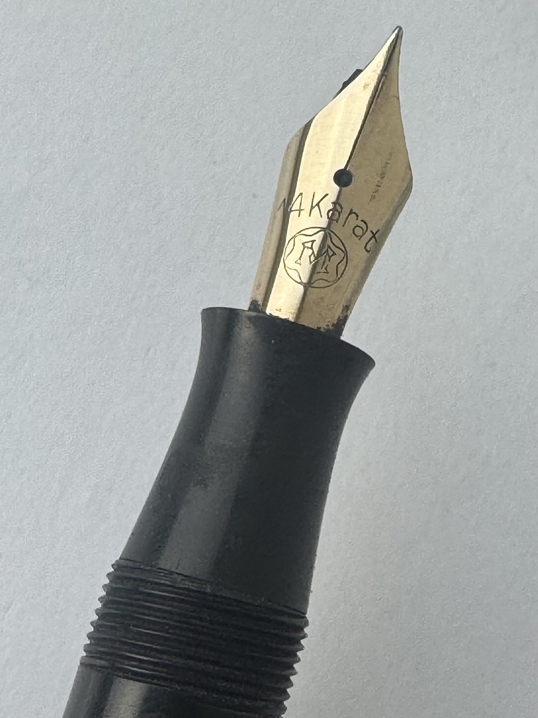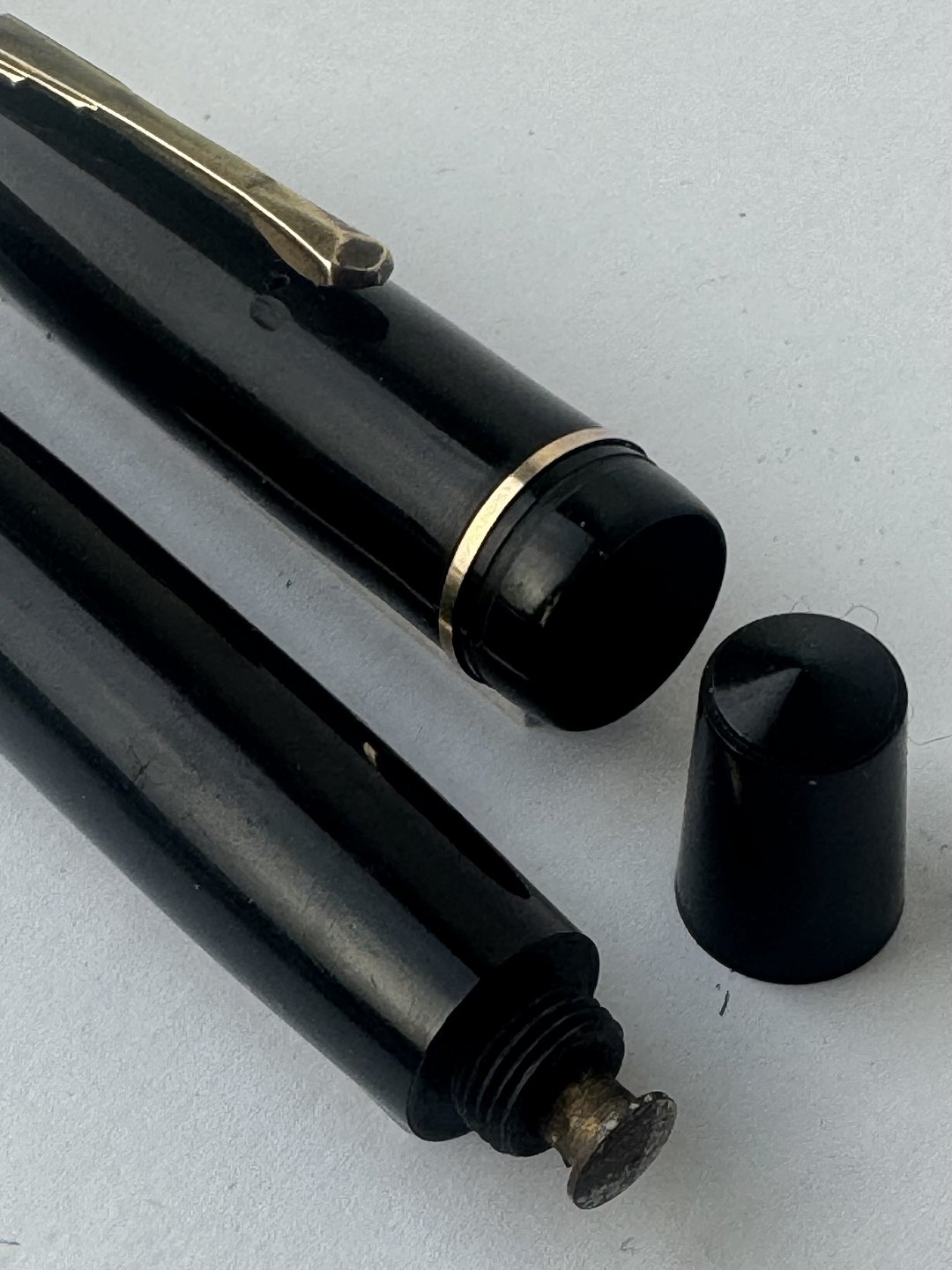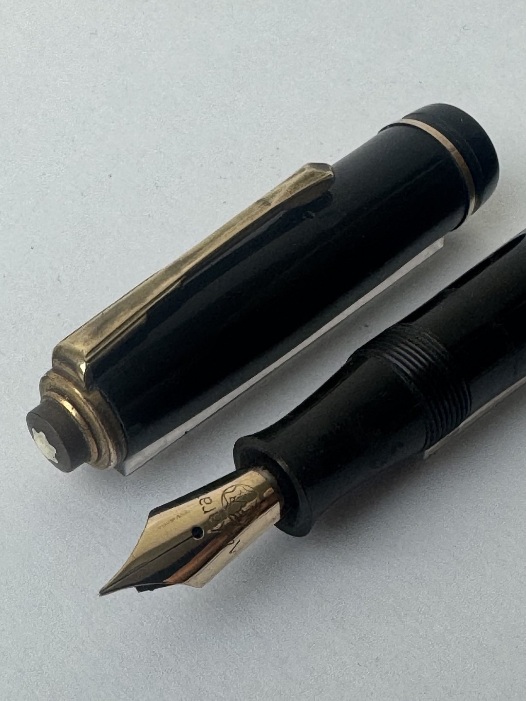 Black Montblanc no. 226 fountain pen. Push button filler. Made in Denmark from the late 1940s. Missing a cap belt on the cap. Otherwise in good condition without damage or repairs. The cap is marked with MONTBLANC the small black bottom screw with the model number 226. A new rubber sack must be inserted before it can absorb ink and write again.