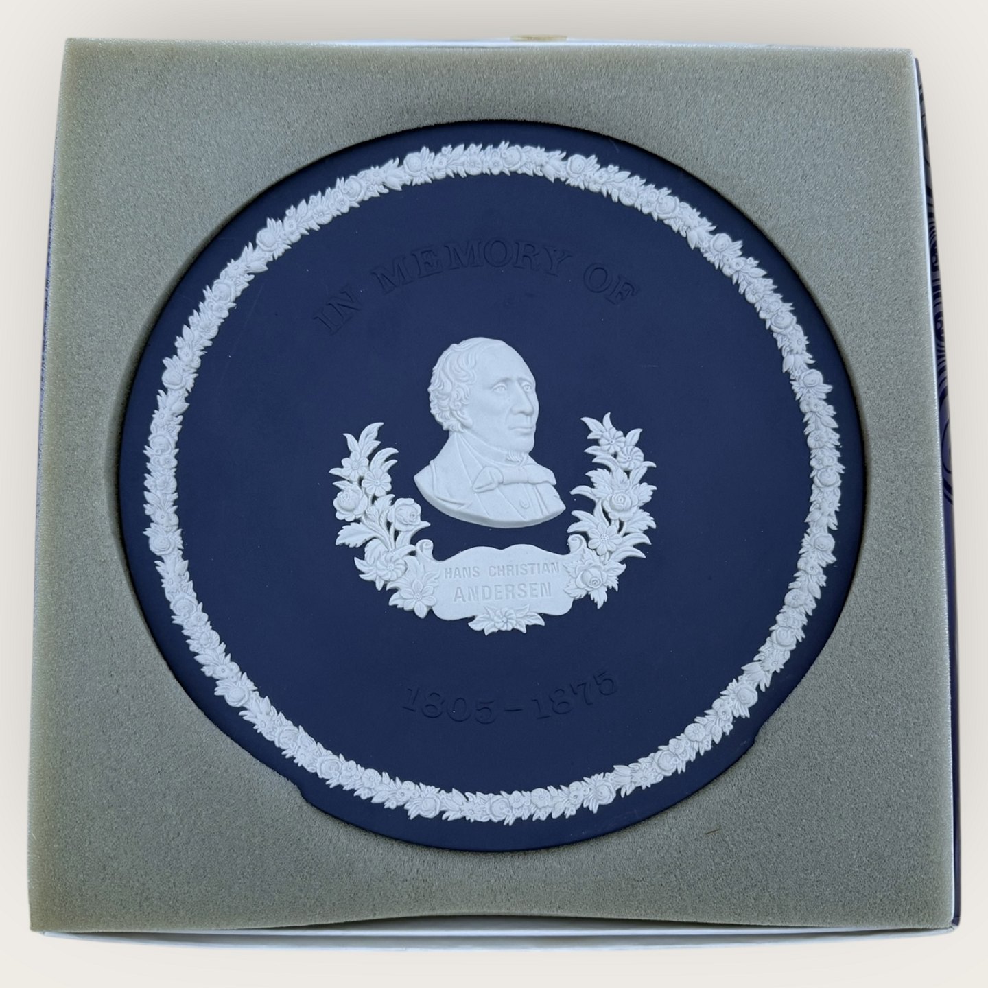 Wedgwood, H.C. Andersen, Dark Blue Memorial Plate, " In memory of H.C. Andersen 1805-1875", plate no. 1045 of 2000 pieces, Diameter 20.5cm, in original box *perfect condition*