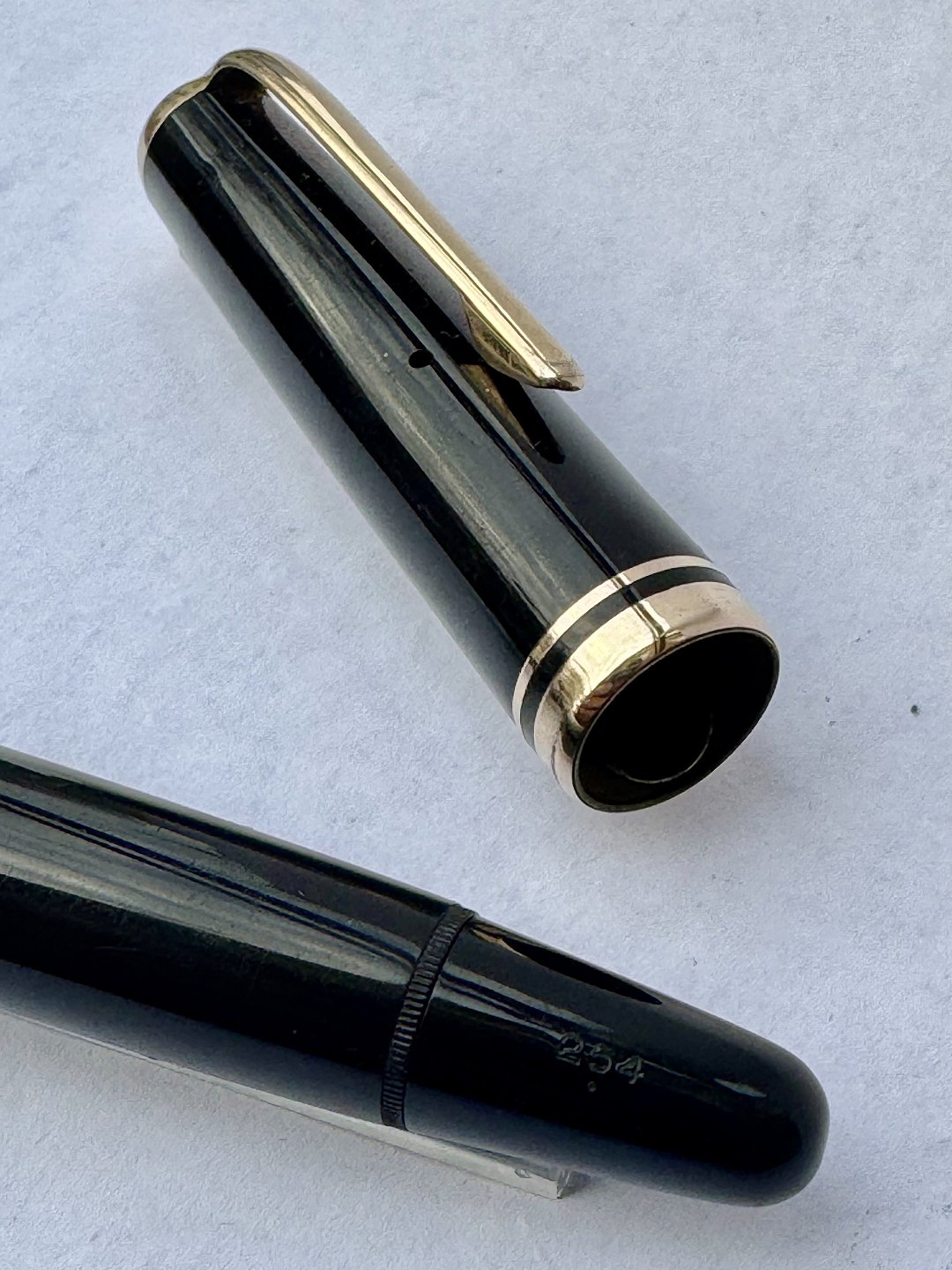 Black Montblanc no. 254 fountain pen with piston filler. In good condition ready to be used. No damage or repairs. All parts original Montblanc parts including a 14 carat