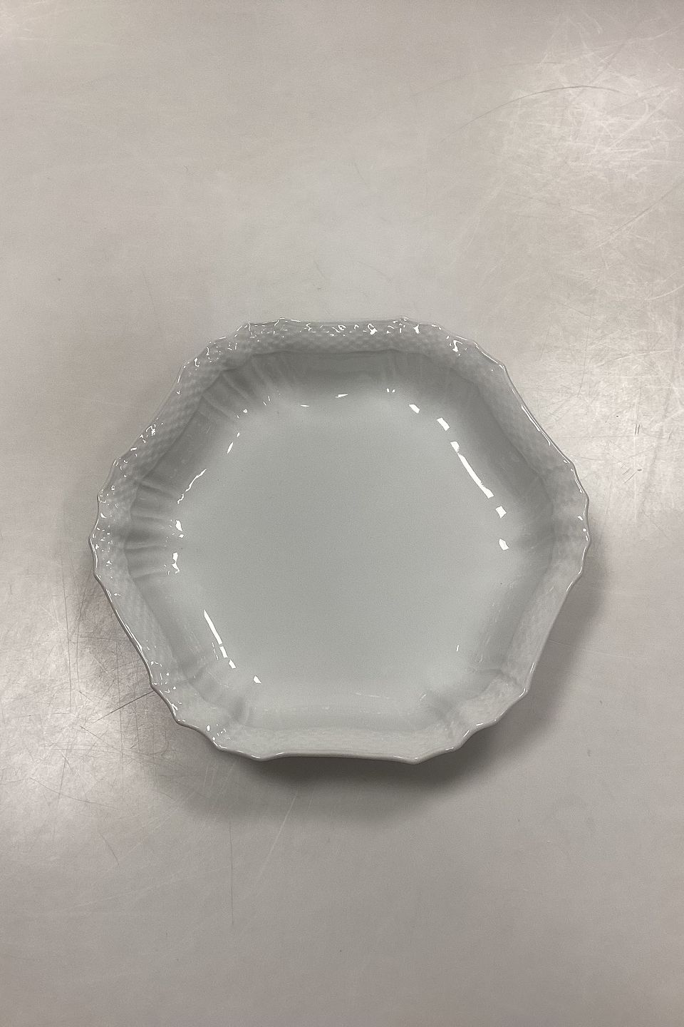 Royal Copenhagen Josephine White Curved Hexagonal Bowl No. 421. Measures 21 cm x 22.5 cm / 8.26 in. x 8.85 in. 2nd Quality with small glaze flaw on underside of rim.