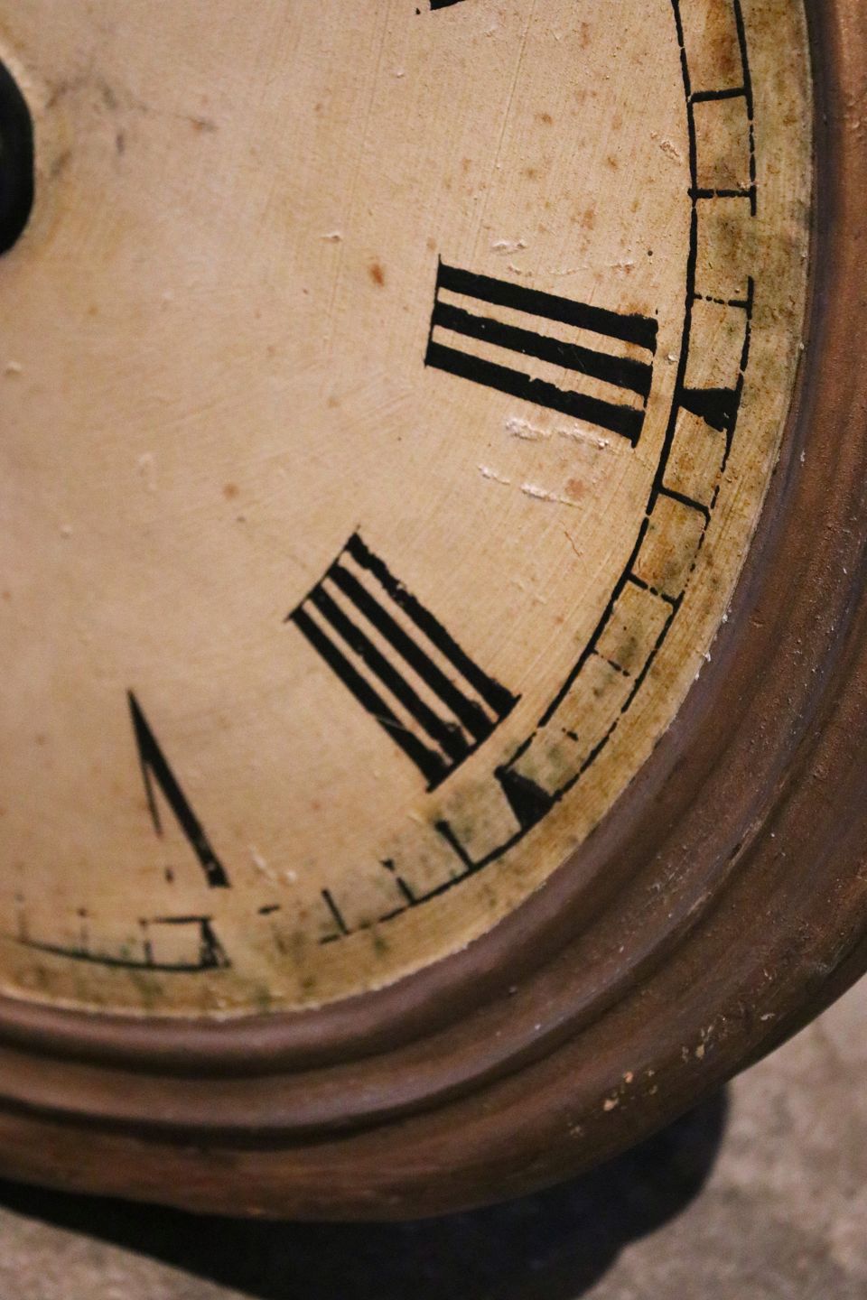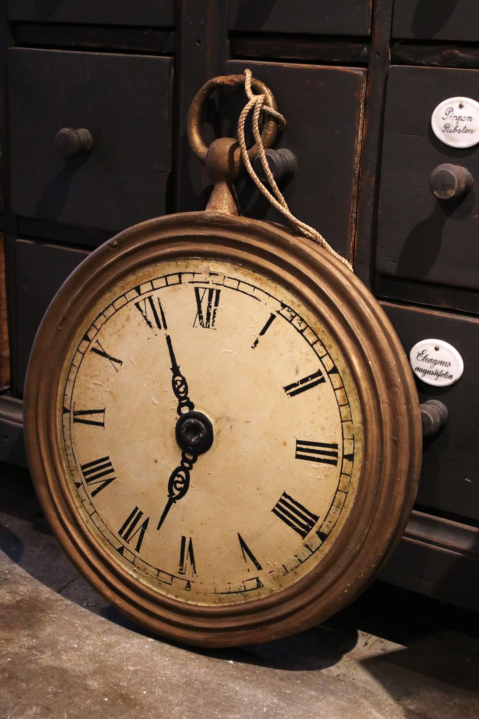 Decorative old wooden "clock" from a watchmaker's shop with old paint and a really nice patina.