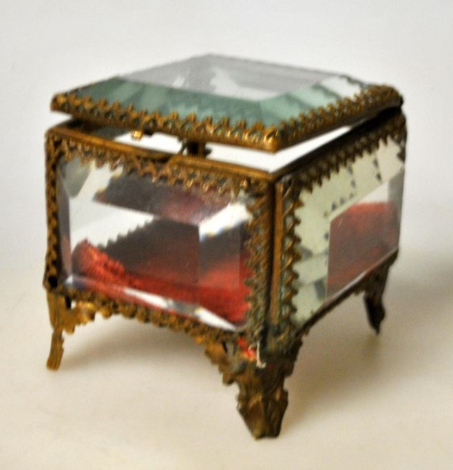 Jewelry box circa 1900. France. With faceted glass and decorated brass frames and four legs. 6.5 x 6 x 6.5 cm.