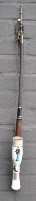 Danish porcelain soldier's pipe, 1878, Copenhagen. Painted white porcelain. Painted with the text: Søren Villadsen, 8 Batl. 4 Comp. N: 431. Remembrance from the camp in Dyrehaven. With a pipe of turned wood and braided horsehair. With iron grate at the mouth of the pipe. Mouthpiece of horn. L.: 70 cm.