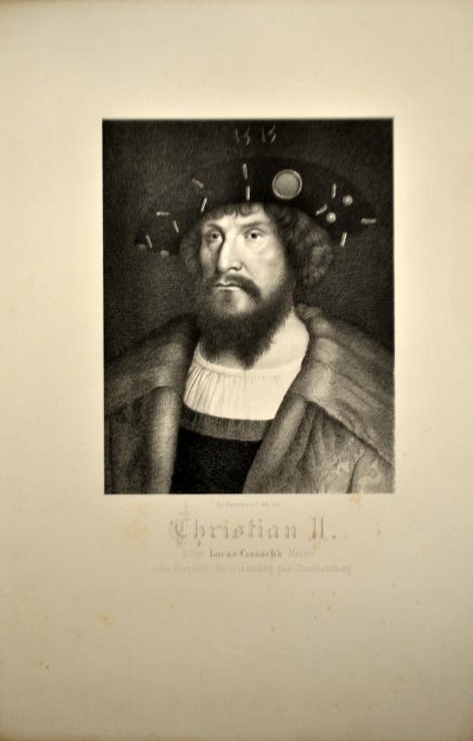 Bærentzen, Emil ( 1799 - 1868 ) Denmark: Portrait of King Christian II. After Lucas Cranach's painting in the Royal Collection of Paintings. Lithograph. Print: 15.5 x 12 cm.