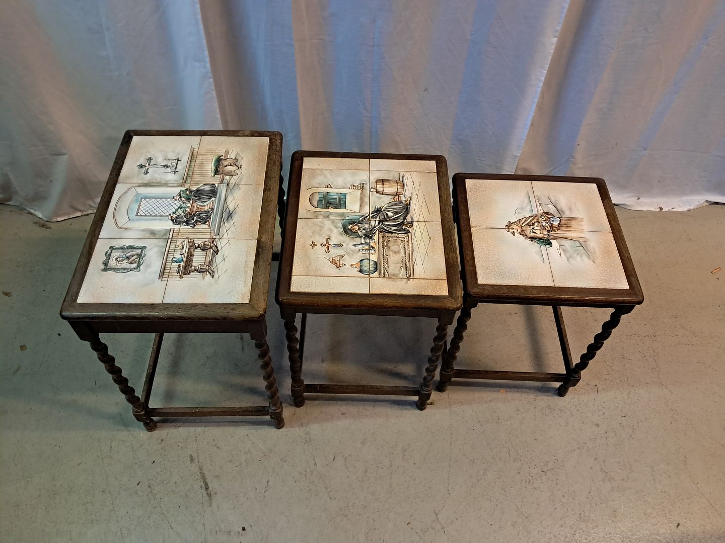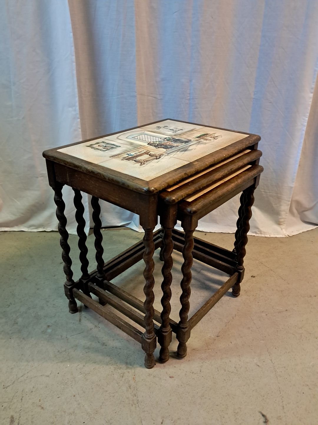 3 Indskudsborde i massivt egetræ med kakler, fra 19330erne.