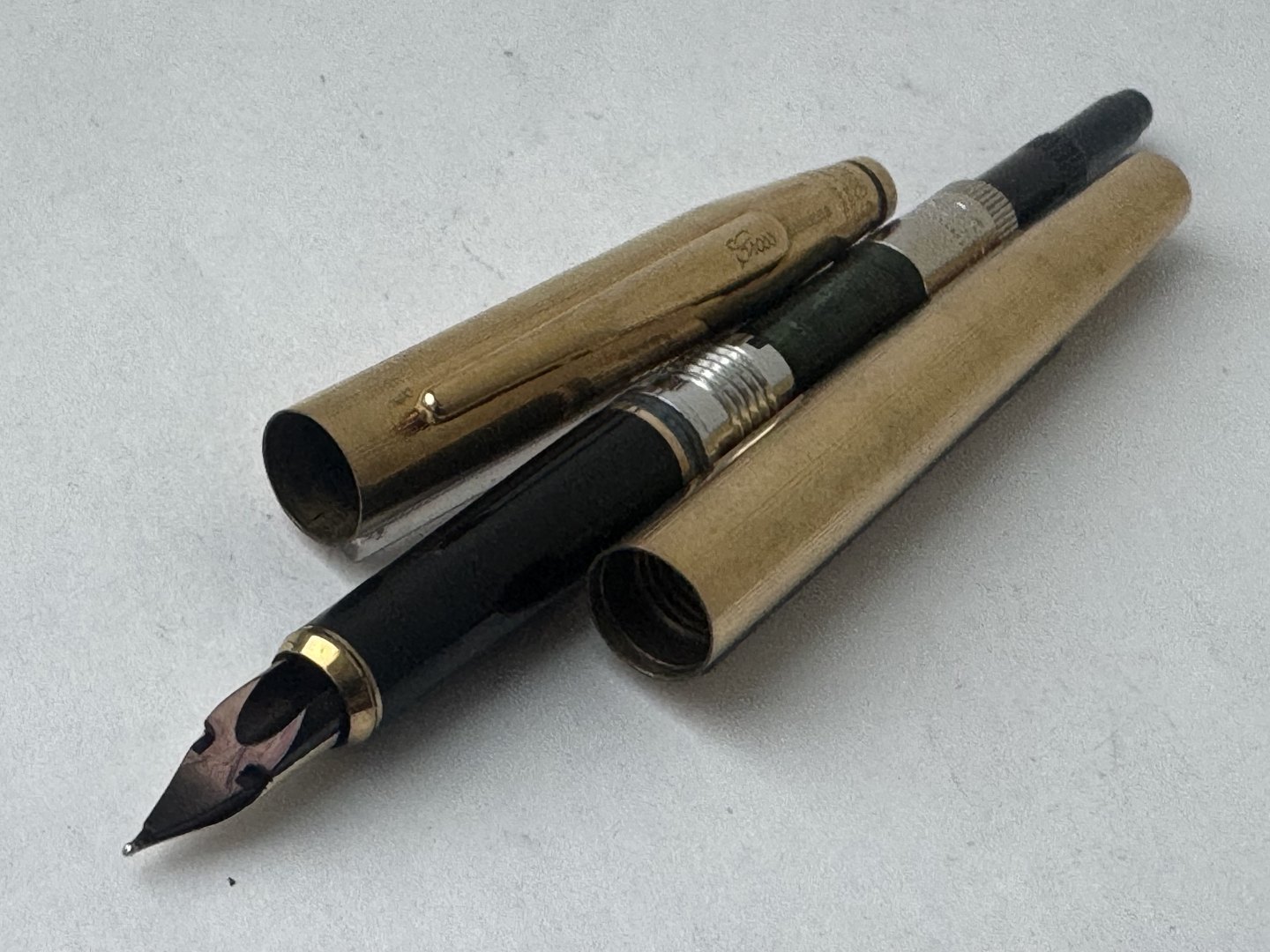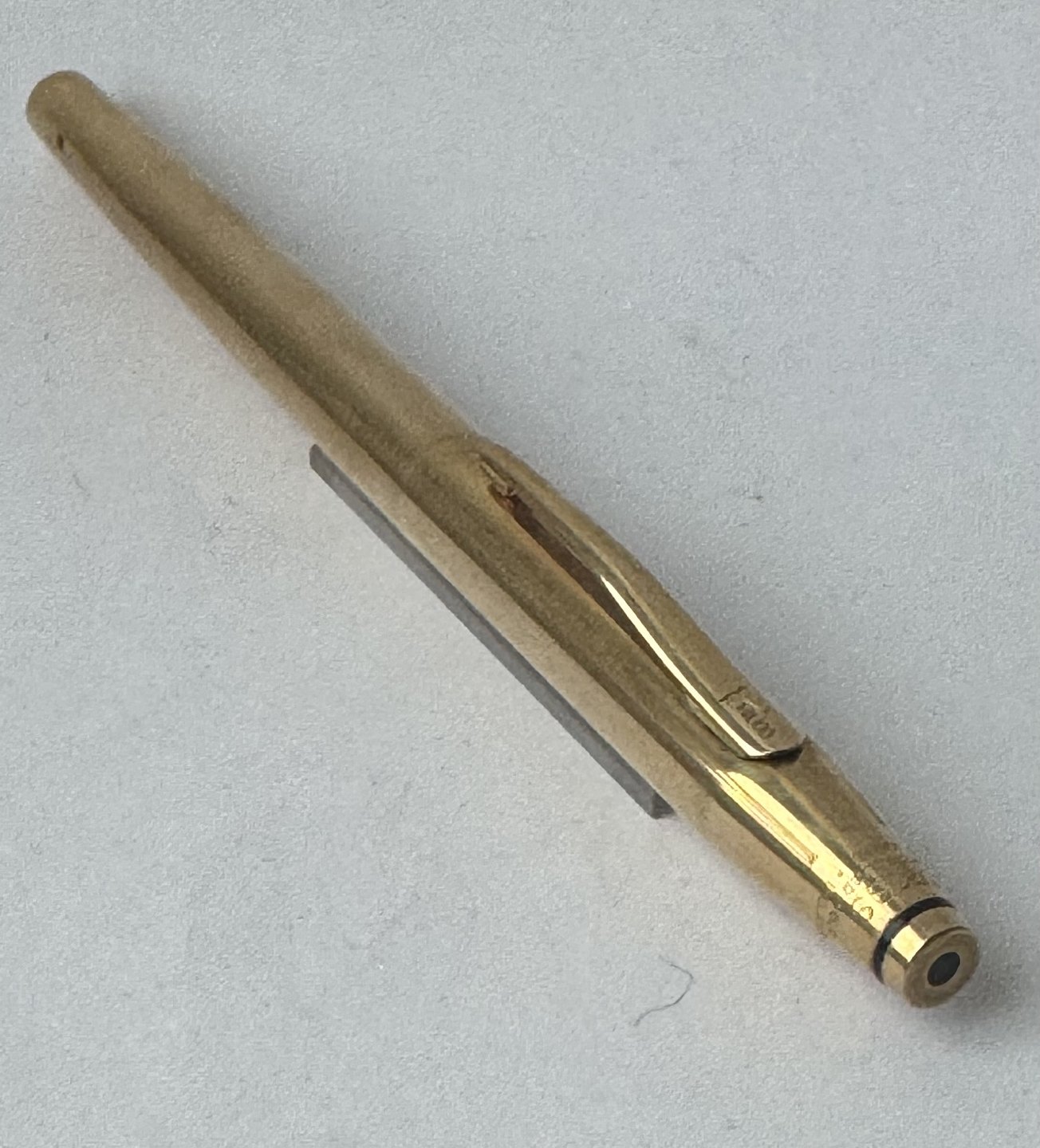 Cross fountain pen in gold-double with piston filler ink filling system. All parts original including a 14 carat gold nib. Appears in good condition and ready to be used. L. 13.4 cm