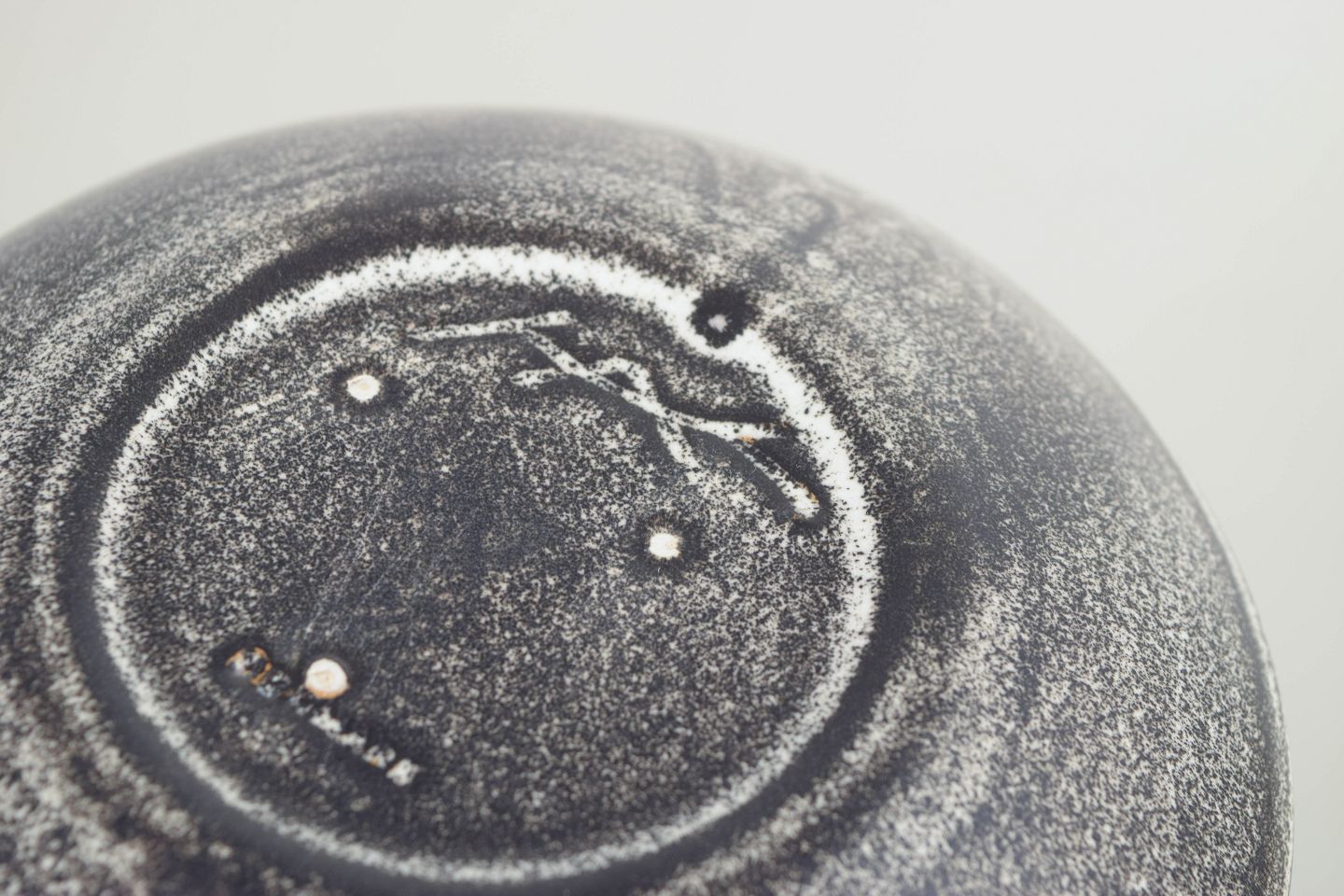 Low, circular stoneware dish with a pronounced rounded rim and a distinctive grey and black double glaze. The subtly metallic surface and restrained, well-balanced form are characteristic of Svend Hammershøi’s work for Kähler during the interwar period, where material quality and glaze depth are key elements.