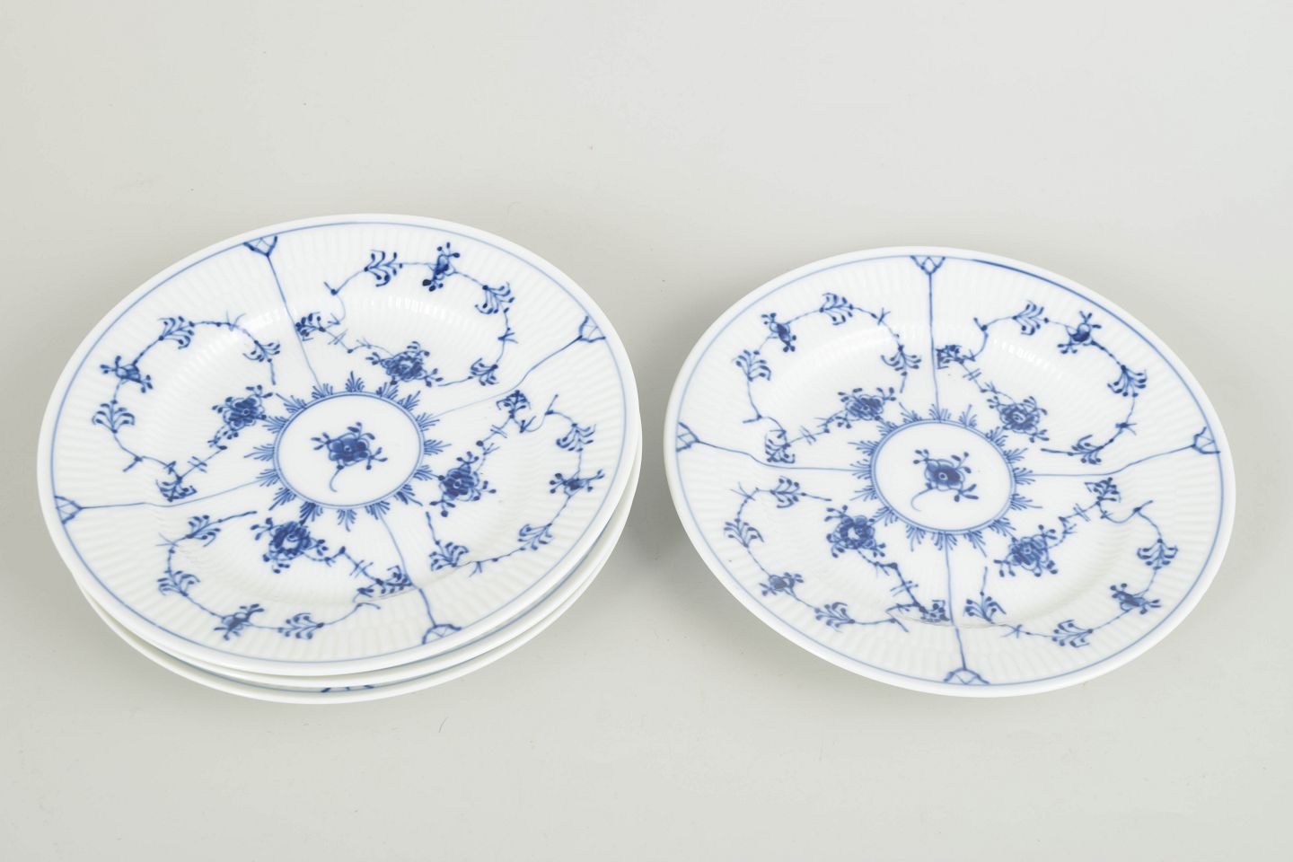 Set of four salad plates in the Blue Fluted Plain pattern. The plates are made in the classic smooth form without lace border and decorated with hand-painted cobalt blue underglaze. A timeless and practical set suitable for salads and smaller servings.