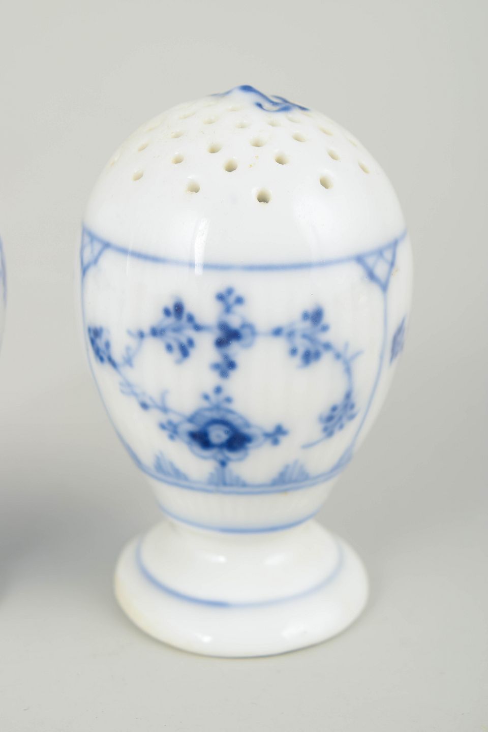 Antique salt and pepper set in the Blue Fluted Plain pattern, made in the classic smooth form without lace border and decorated with hand-painted cobalt blue underglaze. The baluster-shaped shakers with pierced tops stand on small pedestal bases and represent an elegant and functional table accessory from the turn of the century.