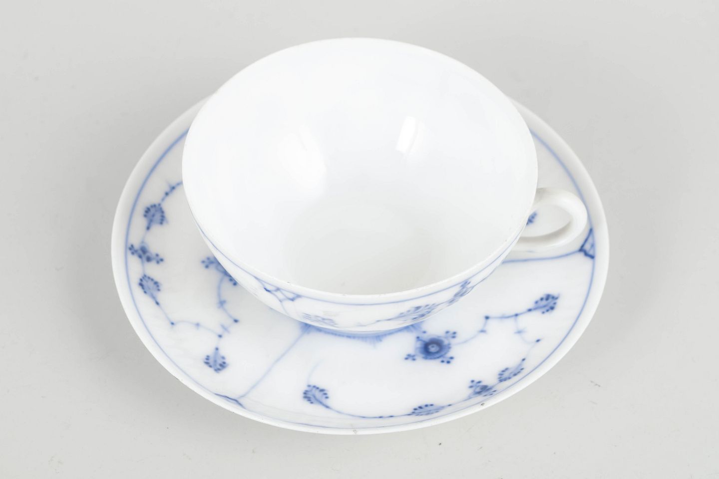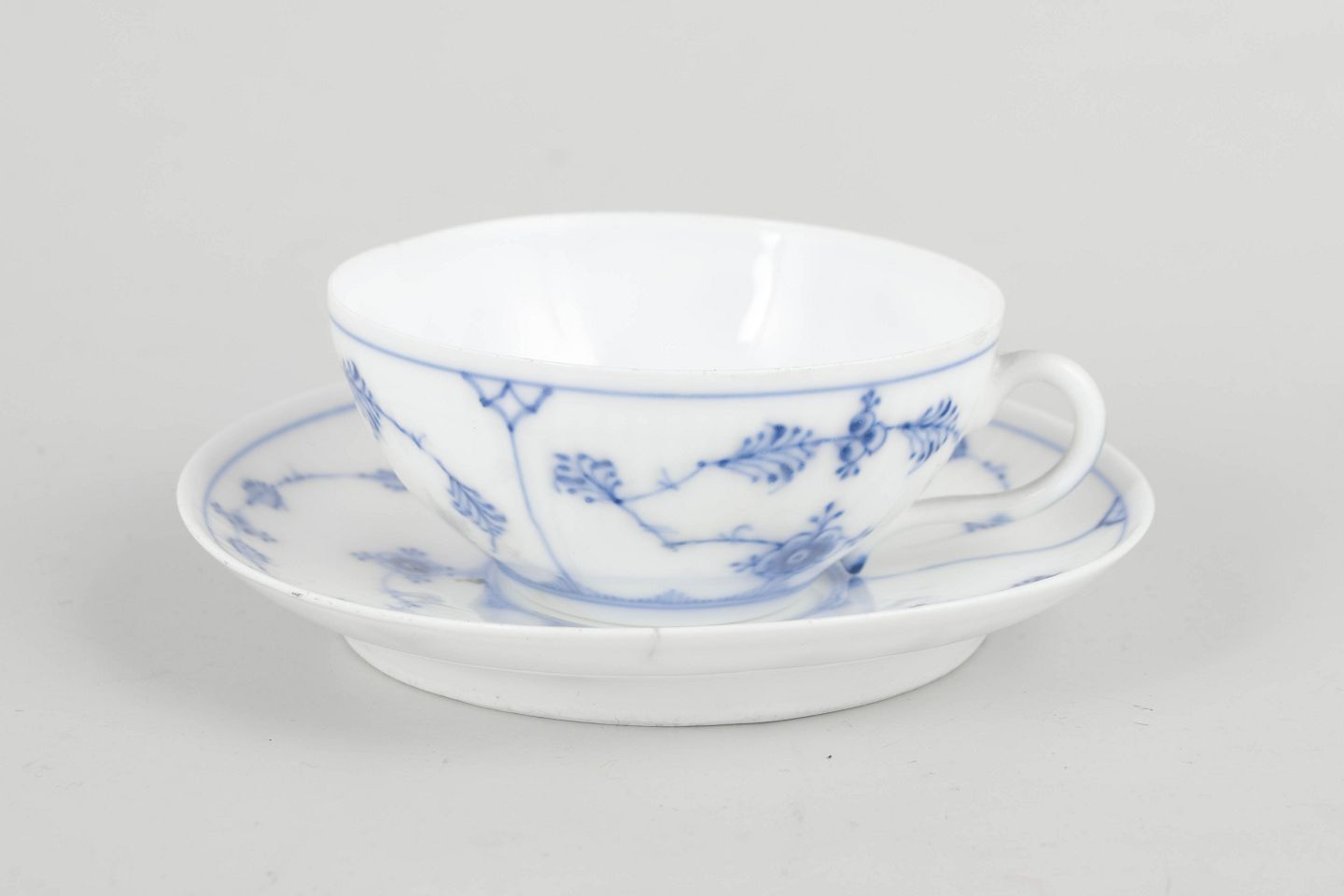 Antique demitasse cup with matching saucer in the Blue Fluted Plain pattern. The cup is made in the classic smooth form without lace border and decorated with hand-painted cobalt blue underglaze in the iconic fluted pattern. A refined early example of Royal Copenhagen coffee ware from the late 19th century.