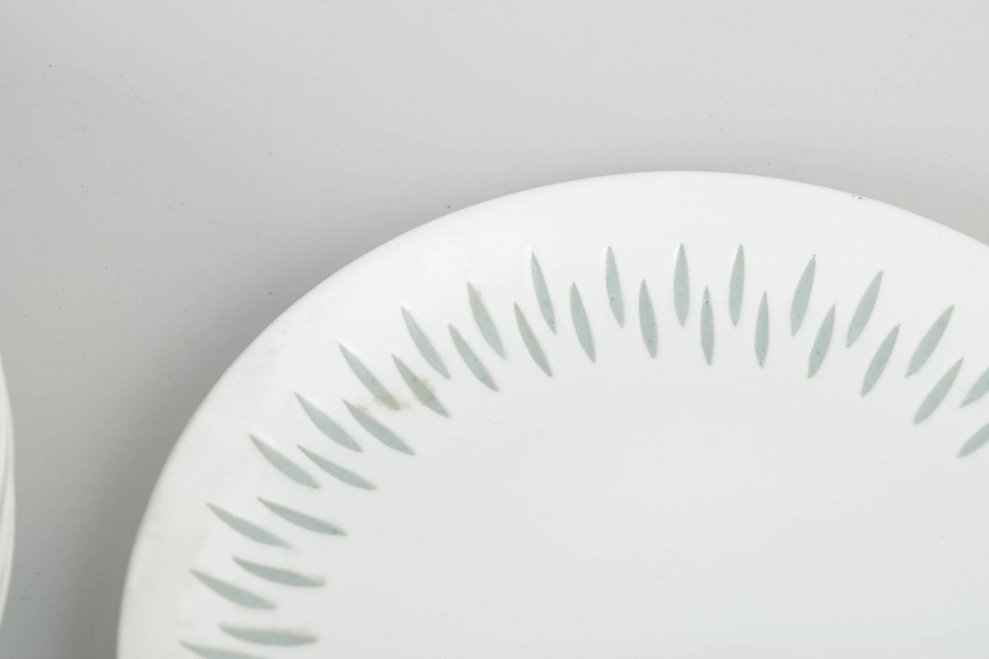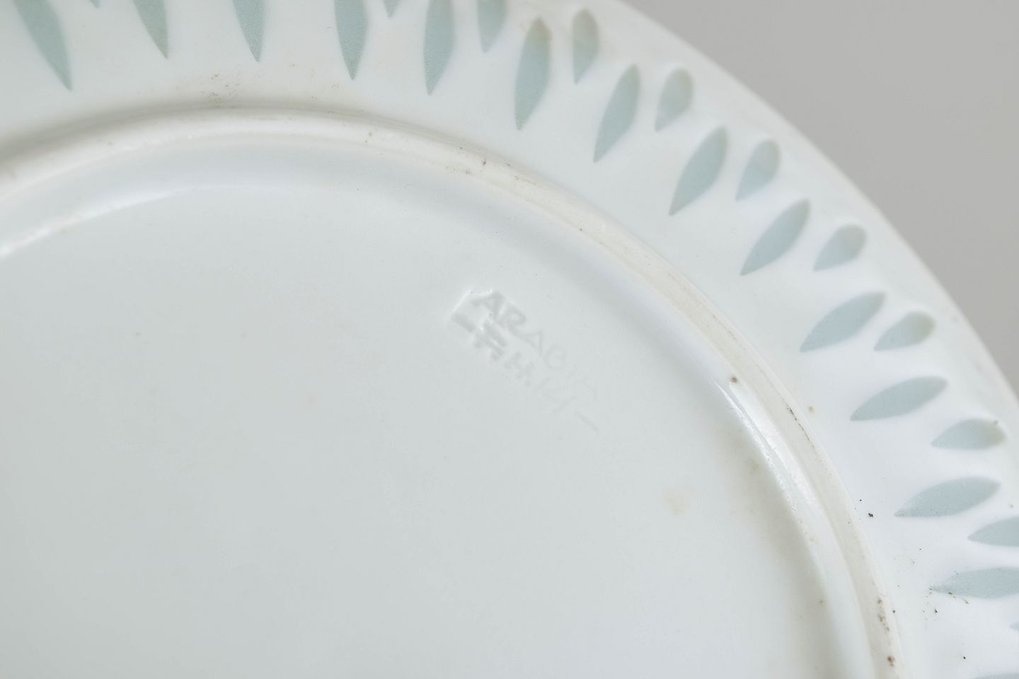 Set comprising six plates in white porcelain decorated with characteristic “rice porcelain” ornamentation along the rim. The elongated transparent glaze areas form a light, rhythmic border, giving the plates an elegant and airy appearance. The restrained design language is typical of Friedl Holzer-Kjellberg’s later porcelain production for Arabia.