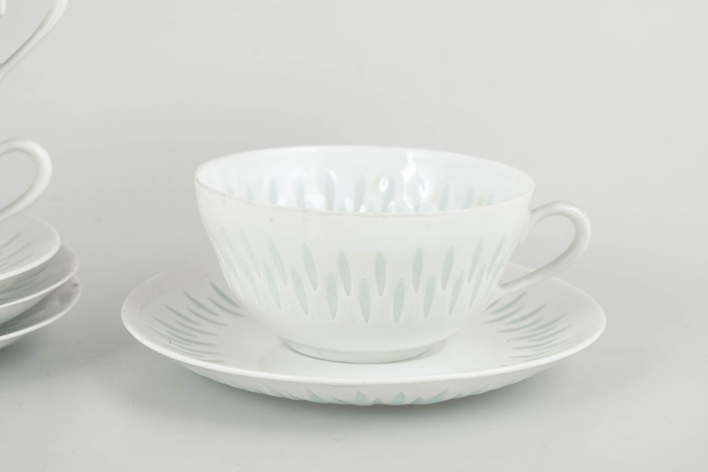 Set comprising four tea cups with matching saucers in white porcelain with pierced “rice porcelain” decoration. The elongated perforations filled with transparent glaze create a light and almost translucent appearance, while the simple rounded forms are characteristic of Friedl Holzer-Kjellberg’s later modernist porcelain designs for Arabia.