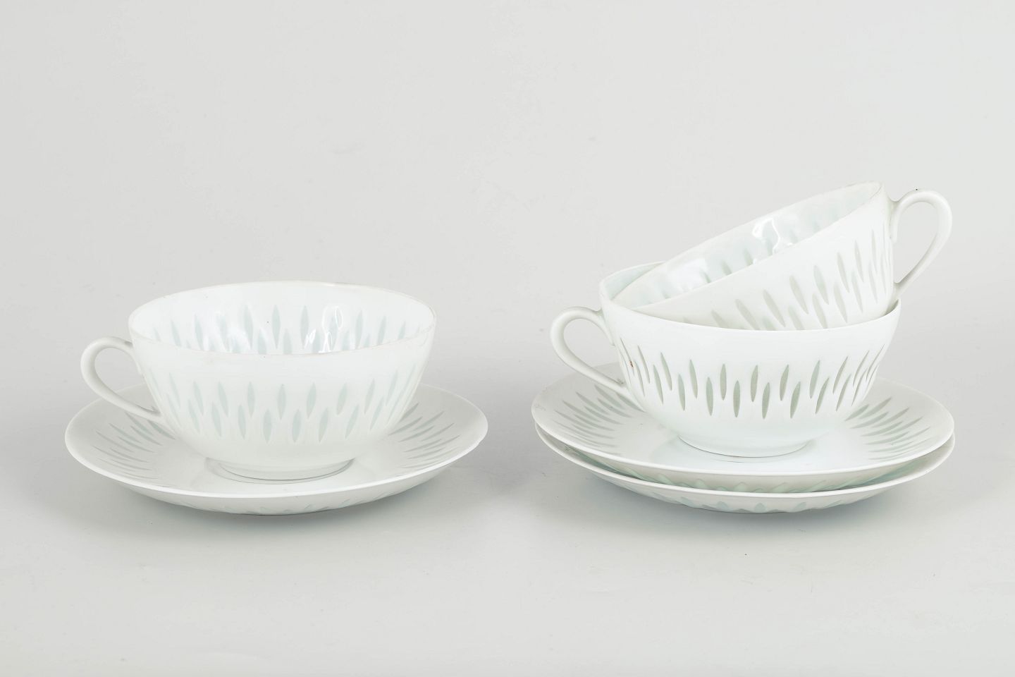 Set comprising three tea cups with matching saucers in white porcelain with pierced “rice porcelain” decoration. The elongated perforations filled with transparent glaze create a light and almost translucent appearance, while the simple rounded forms are characteristic of Friedl Holzer-Kjellberg’s later modernist porcelain designs for Arabia.