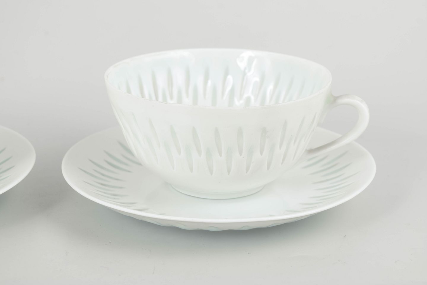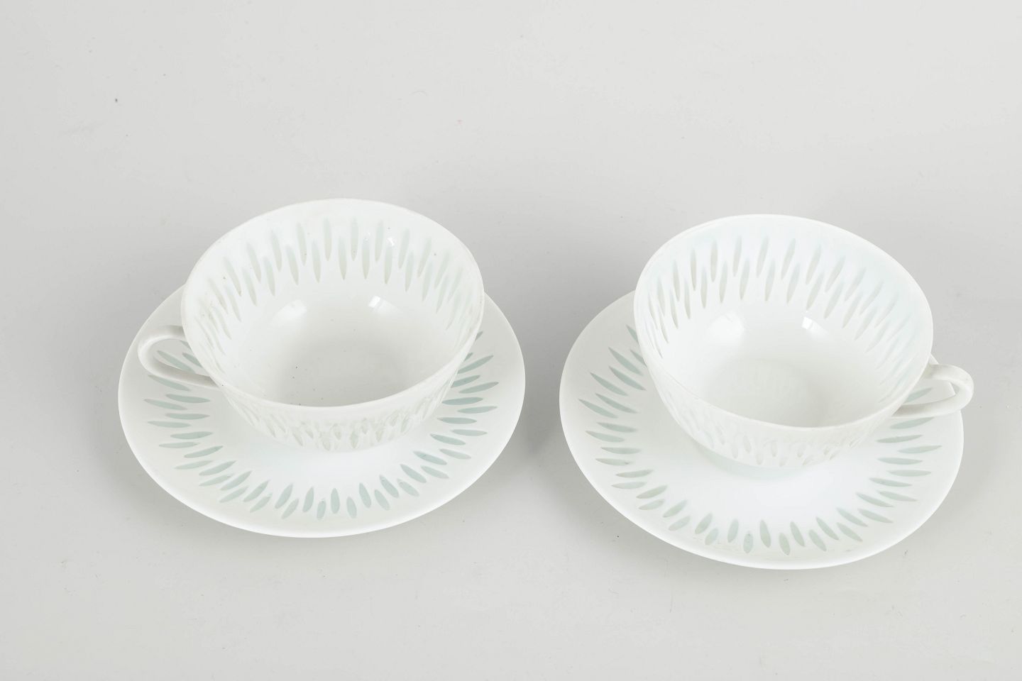 Set comprising two tea cups with matching saucers in white porcelain with pierced “rice porcelain” decoration. The elongated perforations filled with transparent glaze create a light and almost translucent appearance, while the simple rounded forms are characteristic of Friedl Holzer-Kjellberg’s later modernist porcelain designs for Arabia.