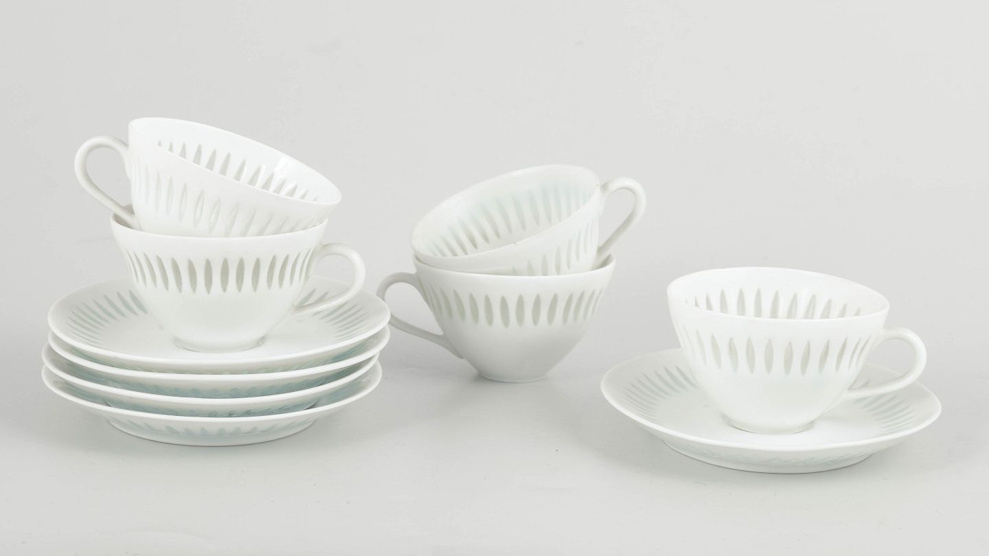 Larger set comprising five demi-tasse coffee cups with matching saucers in white porcelain with pierced “rice porcelain” decoration. The fine elongated perforations filled with transparent glaze create a light, almost translucent appearance. The simple, well-balanced forms are characteristic of Friedl Holzer-Kjellberg’s later modernist designs for Arabia.