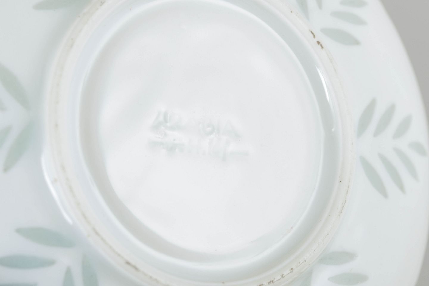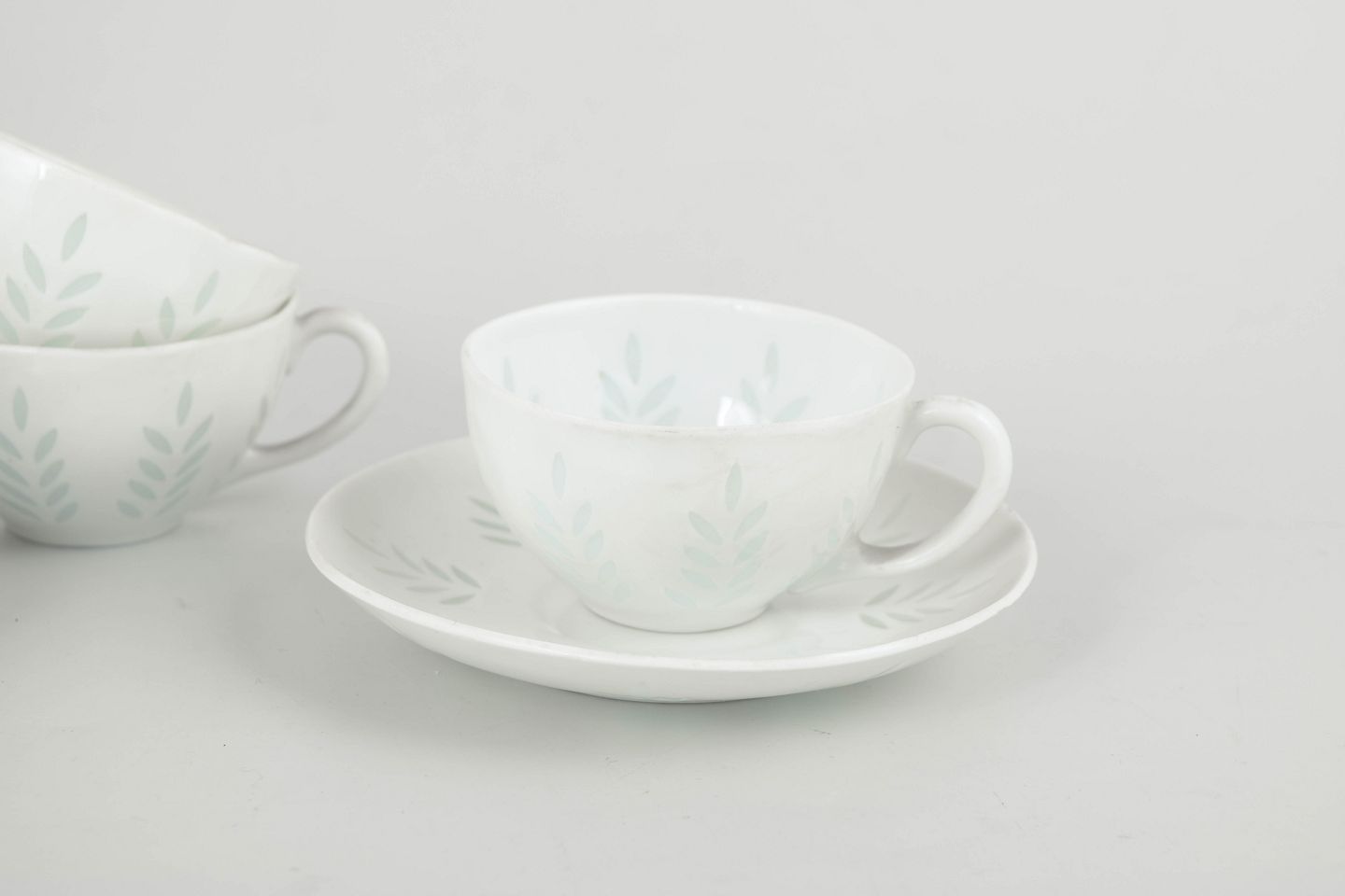 Elegant set comprising four demi-tasse coffee cups with matching saucers in white porcelain, decorated with a subtle leaf motif executed in transparent, lightly green-tinted glaze areas. The light and harmonious appearance combined with softly rounded forms is characteristic of Friedl Holzer-Kjellberg’s later porcelain designs for Arabia.