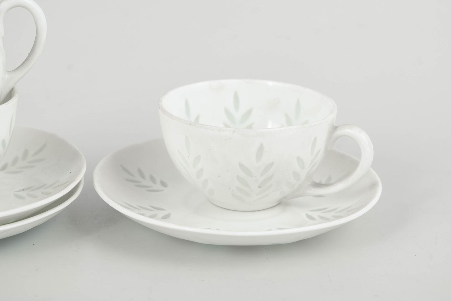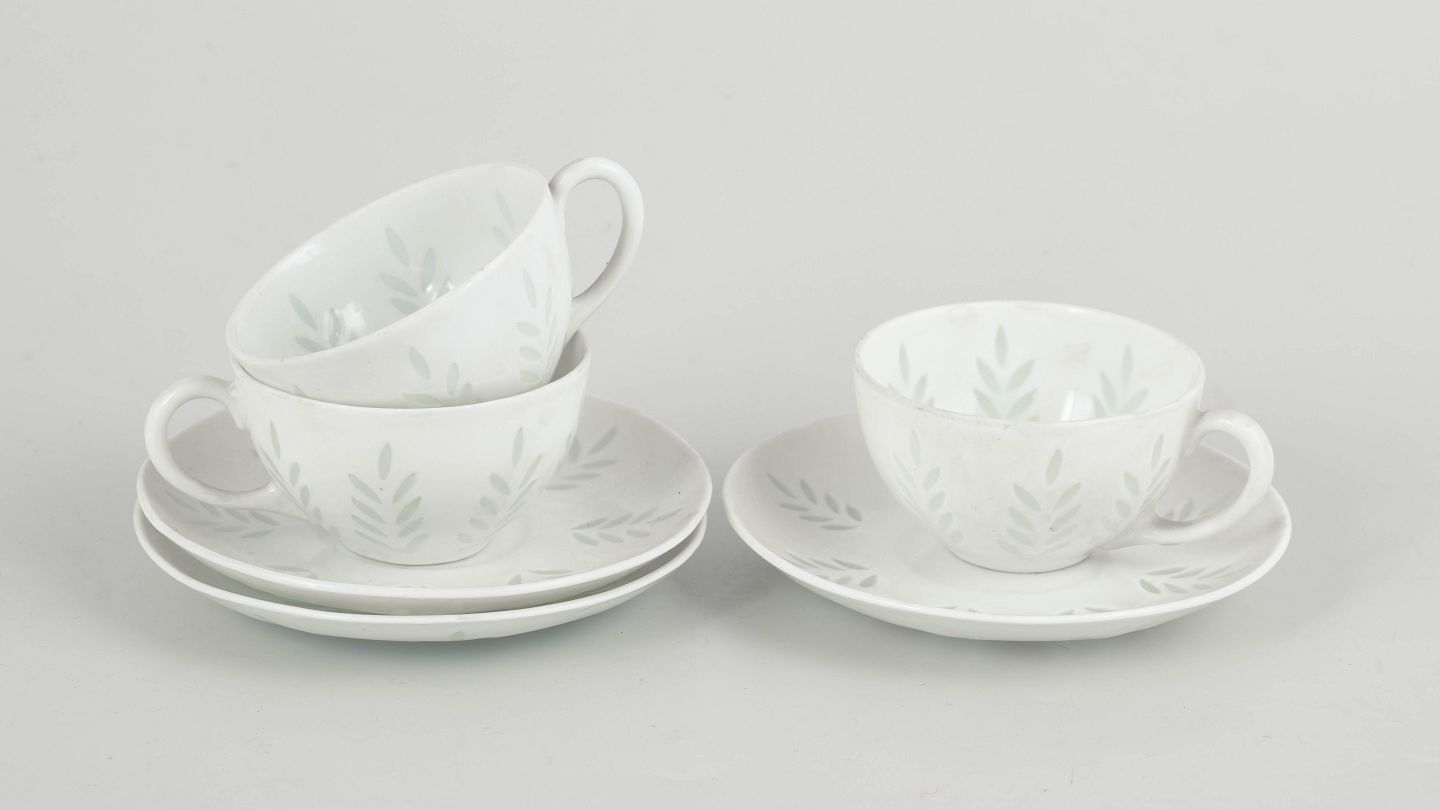 Elegant set comprising three demi-tasse coffee cups with matching saucers in white porcelain, decorated with a subtle leaf motif executed in transparent, lightly green-tinted glaze areas. The light and refined appearance, together with softly balanced forms, is characteristic of Friedl Holzer-Kjellberg’s later porcelain designs for Arabia.