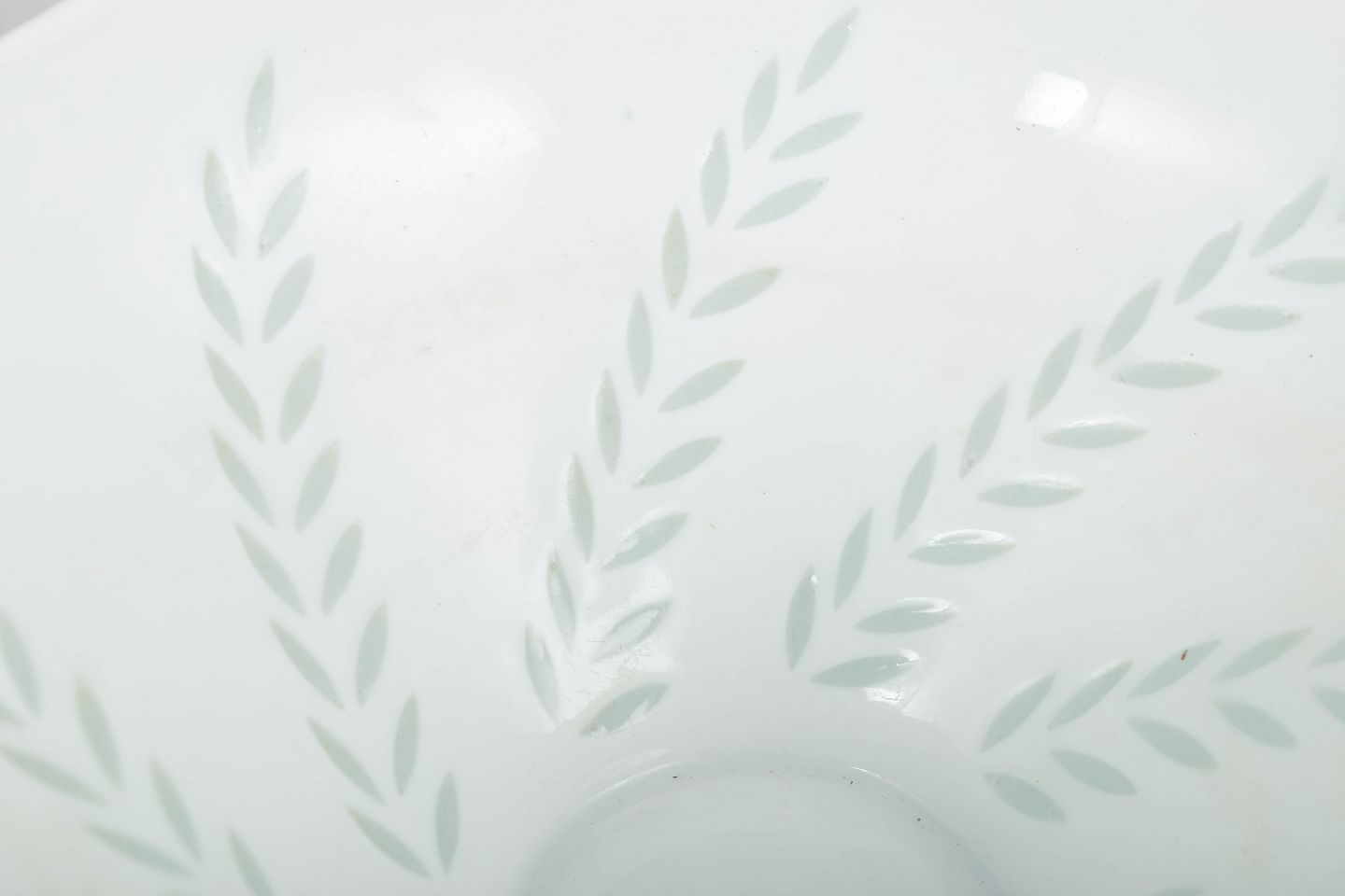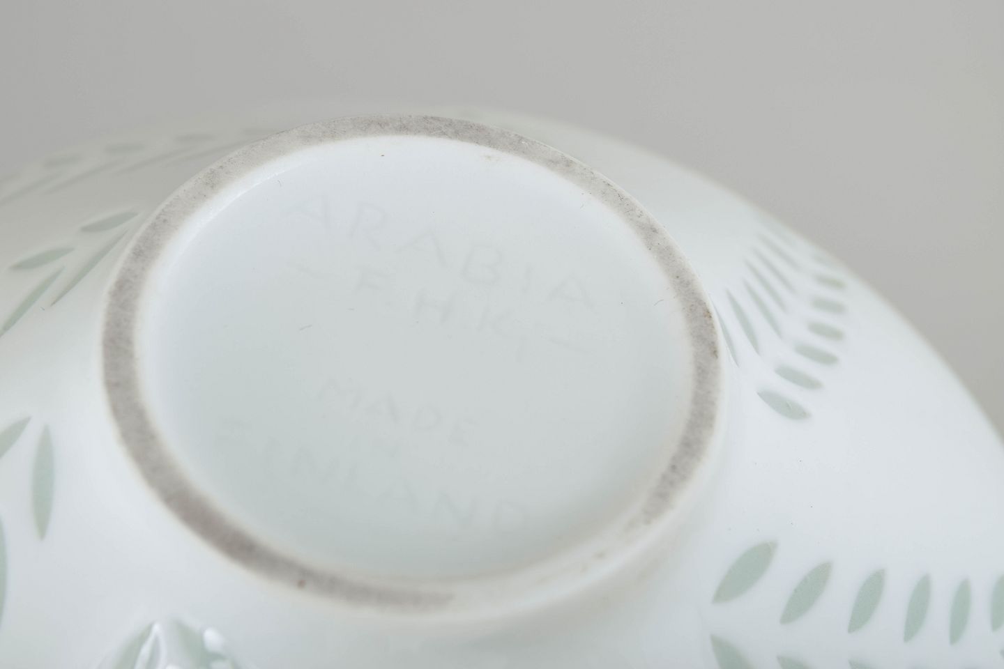 Large bowl in white porcelain with a subtle leaf motif executed in transparent, lightly green-tinted glaze areas. The simple conical form combined with restrained decoration gives the bowl a light and elegant appearance, characteristic of Friedl Holzer-Kjellberg’s modernist porcelain designs for Arabia.
