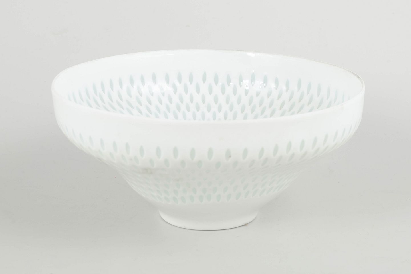 Large, elegant bowl in white porcelain with pierced “rice porcelain” decoration, where the fine perforated pattern creates a light and translucent effect. The balanced conical form and subtle surface treatment are characteristic of Friedl Holzer-Kjellberg’s modernist designs for Arabia.