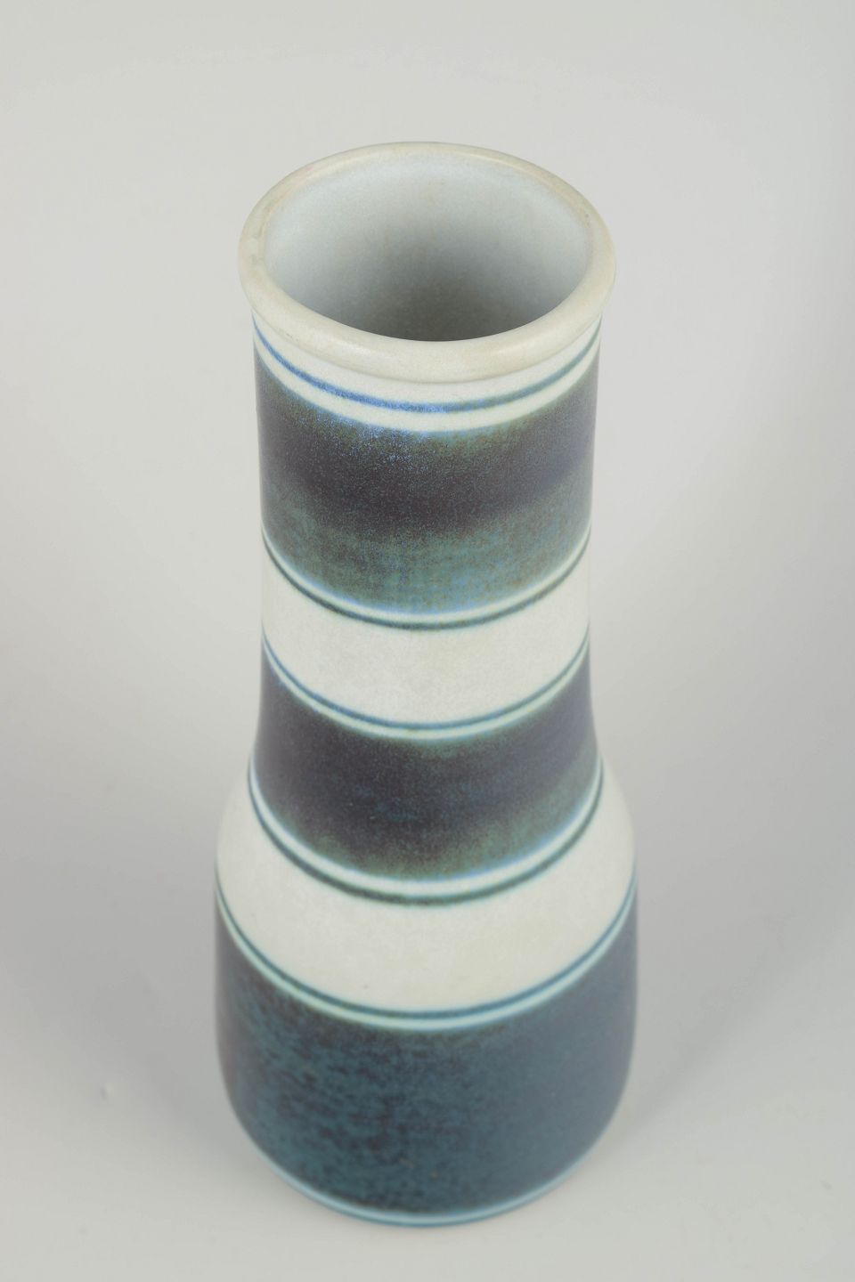 Slim and elegant stoneware vase from Gunnar Nylund’s “Banderillo” series, characterized by pronounced horizontal bands in blue-green and darker tones set against a light ground. The carefully balanced form with a gently narrowed neck gives the vase an architectural and rhythmic appearance, typical of Nylund’s work during the 1960s.