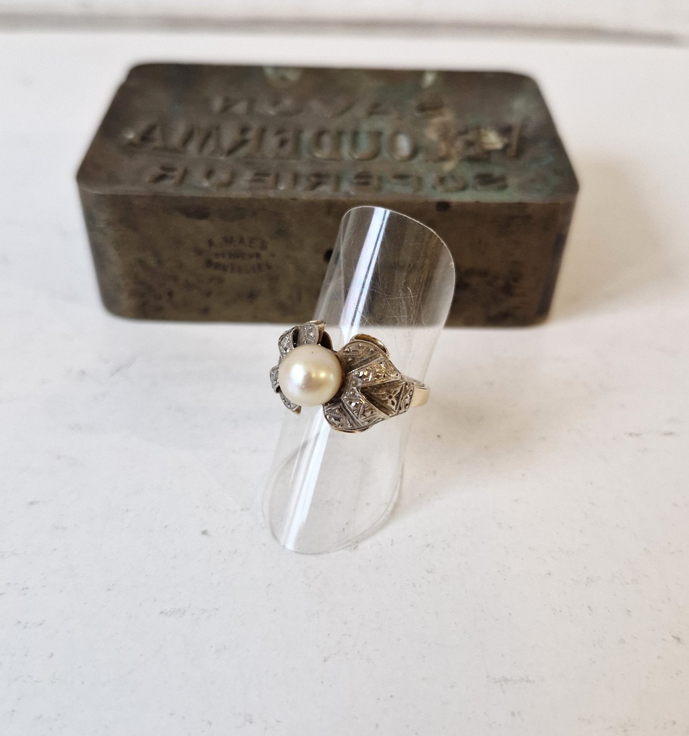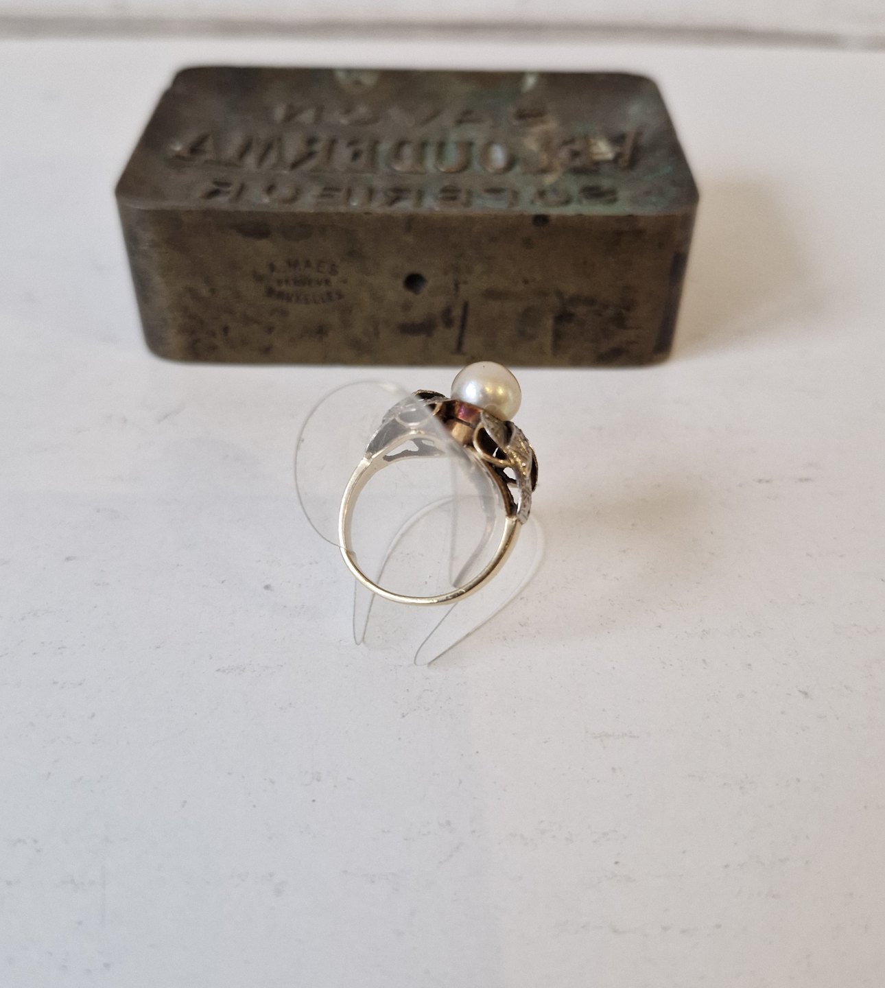 Vintage ring in 18 kt red and white gold with beautiful akoya pearl.