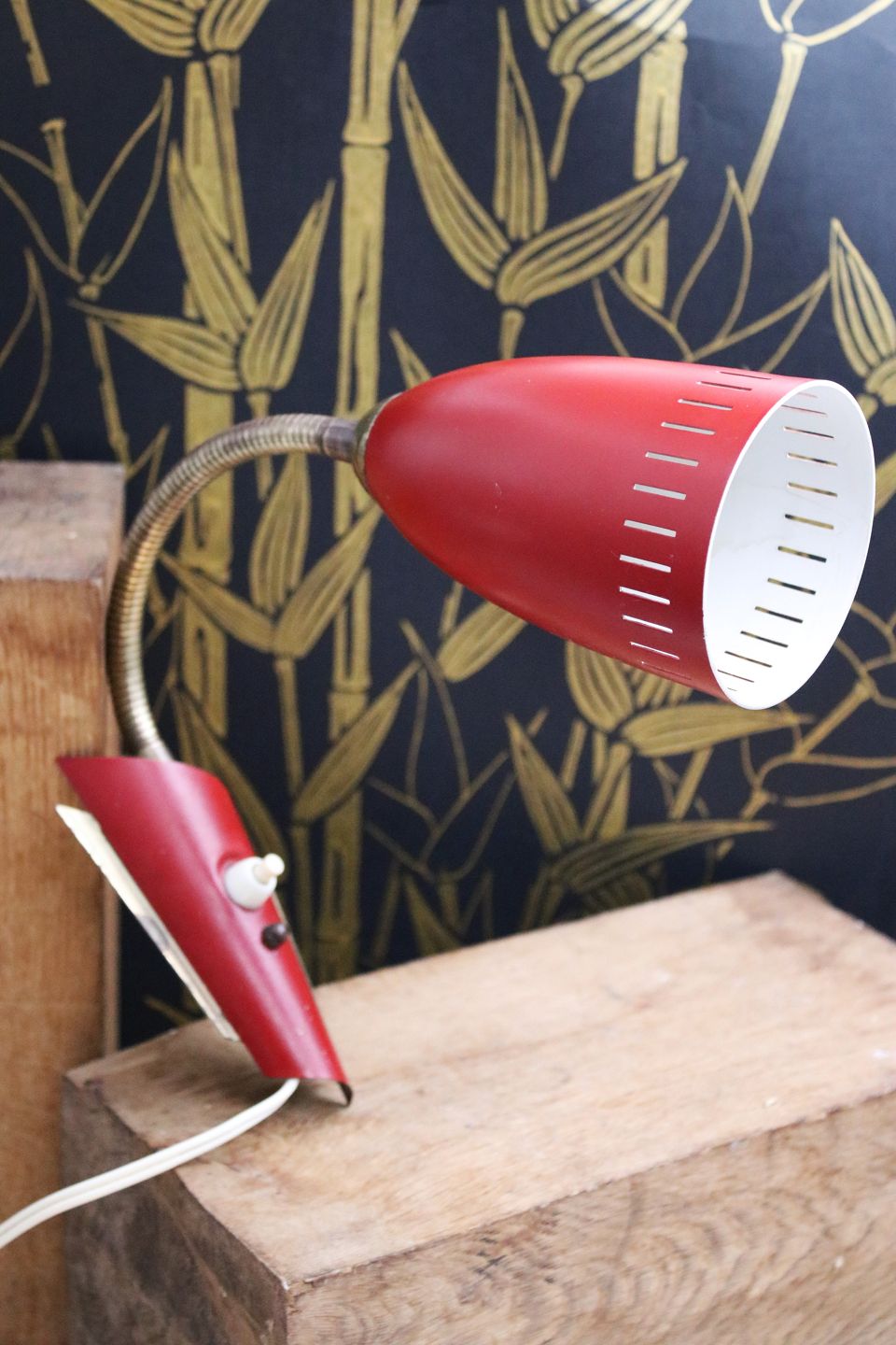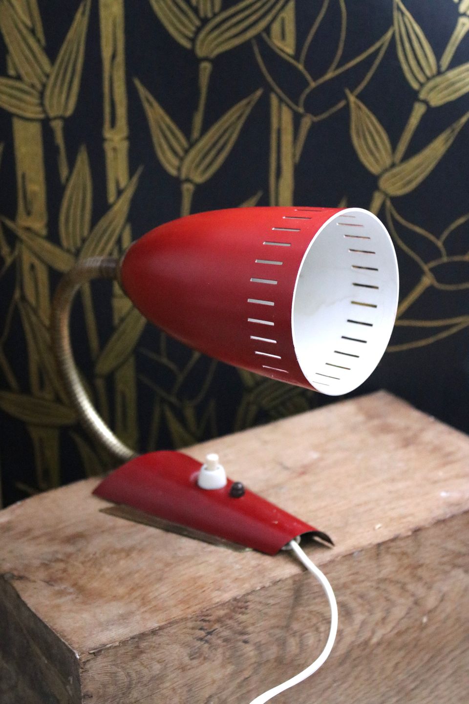 A pair of old retro wall lamps in red painted metal and brass from the 50s. Lampshade L: 14cm. Dia: 8.5cm.
