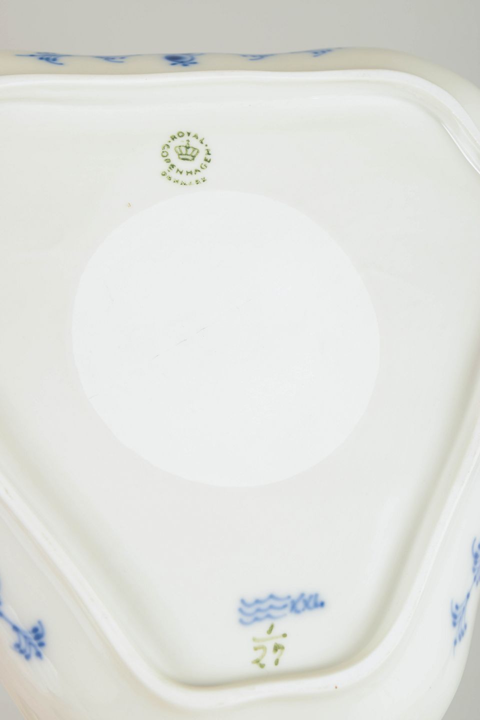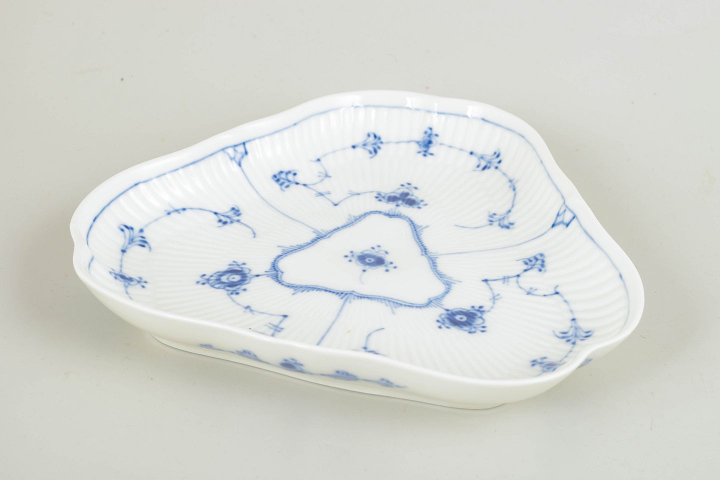 Blue Fluted Plain was introduced in 1775 and is Royal Copenhagen’s oldest and most traditional pattern. Inspired by Chinese blue-and-white porcelain, it is characterised by its disciplined composition, rhythmic brushwork and finely executed hand-painted decoration. More sculptural serving forms such as this triangular dish were produced in smaller numbers and reflect the continued refinement of classic tableware designs in the mid-20th century.