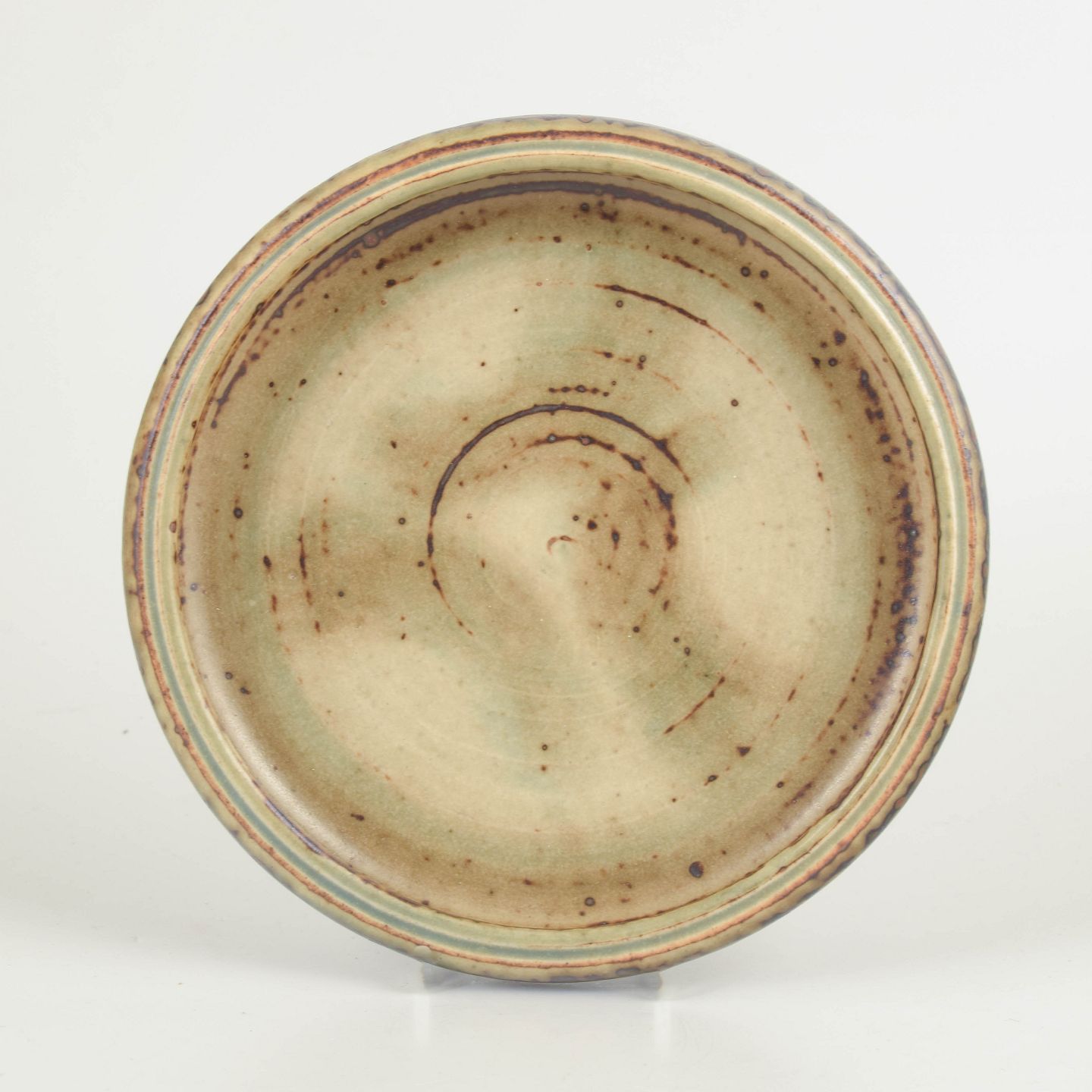 Low, wide stoneware bowl with a calm circular form and a subtle glaze in light sand and soft green tones, accented by fine brown speckling and concentric throwing marks. The design is restrained and balanced, emphasising surface, material, and the natural variation of the glaze.