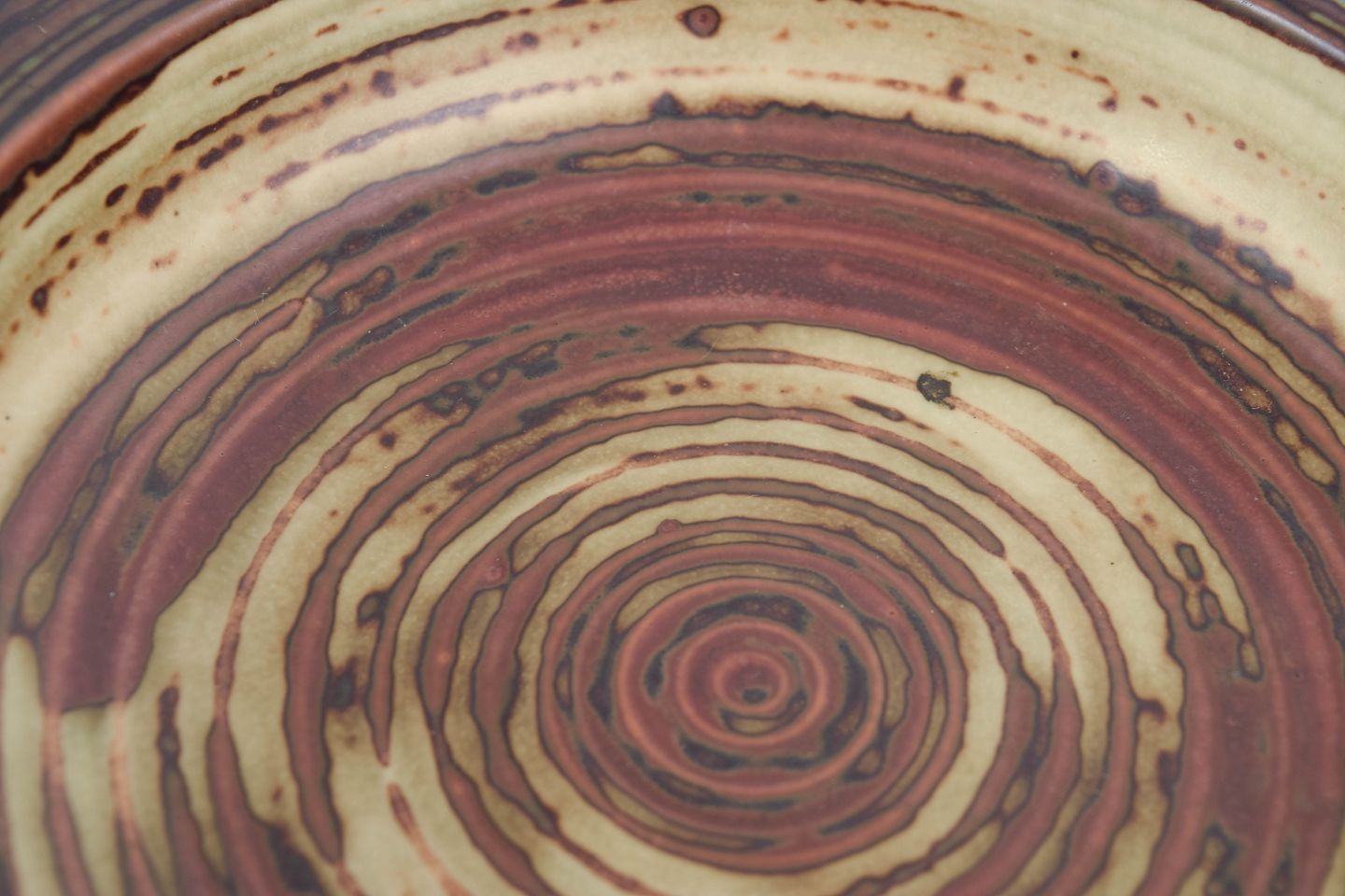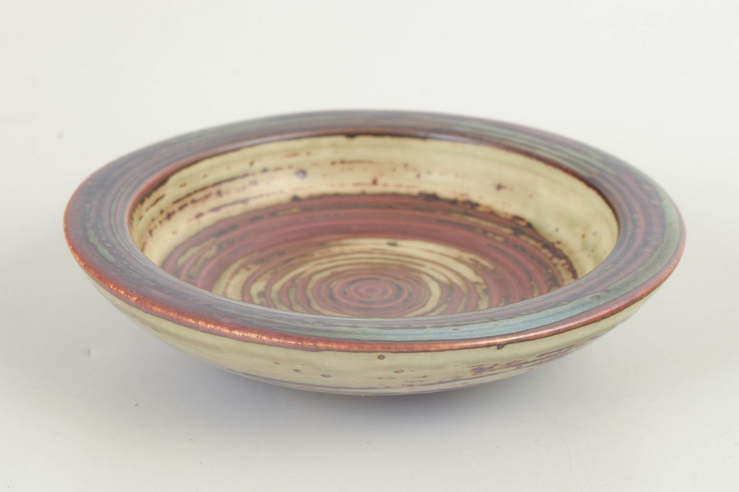 Low stoneware bowl featuring a pronounced concentric pattern and a dynamic glaze in warm earthy tones combined with green and brown hues. The visible wheel marks and circular construction create a graphic yet organic expression, characteristic of Royal Copenhagen’s stoneware from the 1970s.
