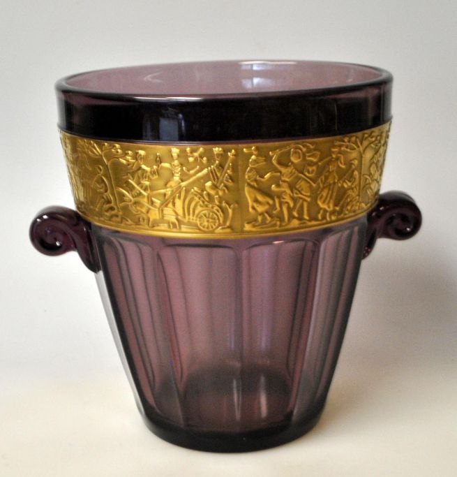 Moser, Ludvig & Söhne, Karlsbad, 1920s: A pair of ice buckets. In violet glass with etched gold frieze with motif, in German called "Krieger". H.: 14 cm.