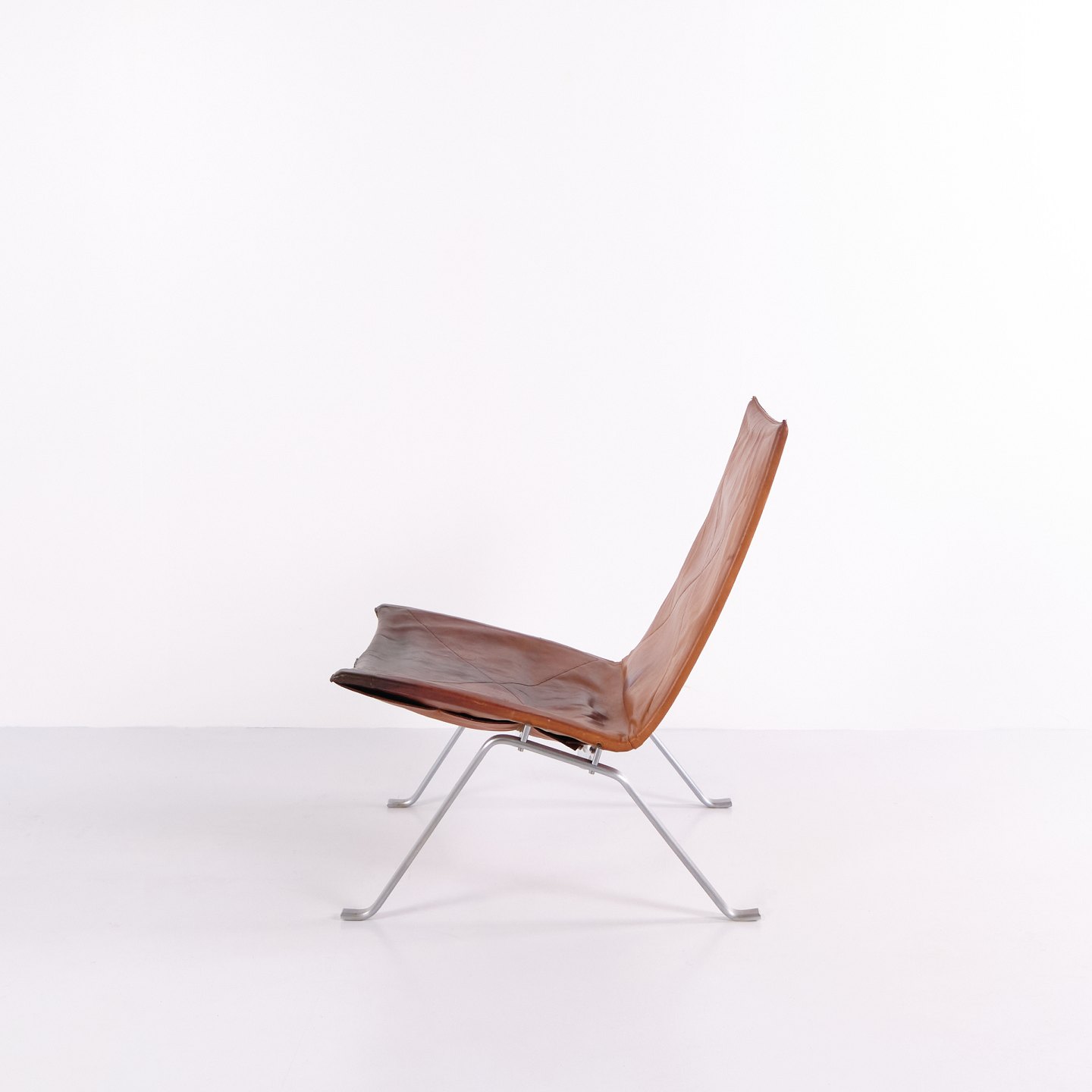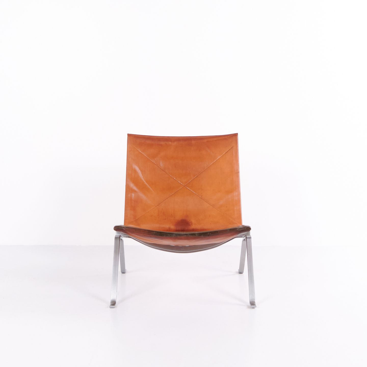 PK22 armchair by Poul Kjærholm for E. Kold Christensen. Original upholstery in patinated cognac leather. Danish design icon from the 1950s.