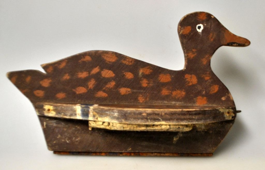 Decoy duck in painted pine, ca. 1920. Denmark. Painted brown with white and blue. Balance with iron and lead. L.: 29 cm. H: 16 cm.