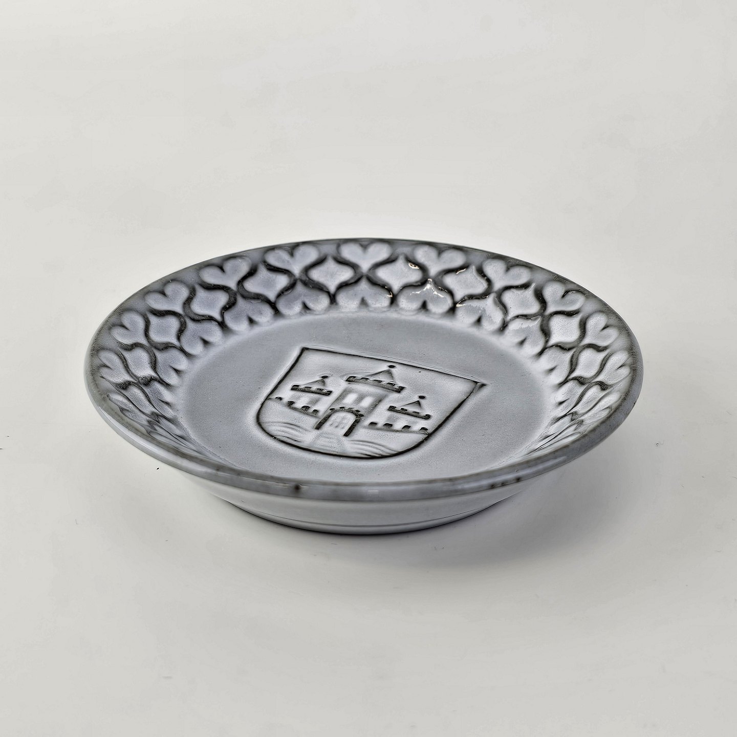 Kuvert askebægre af stentøj fra stellet Grå Cordial, med Randers Byvåben