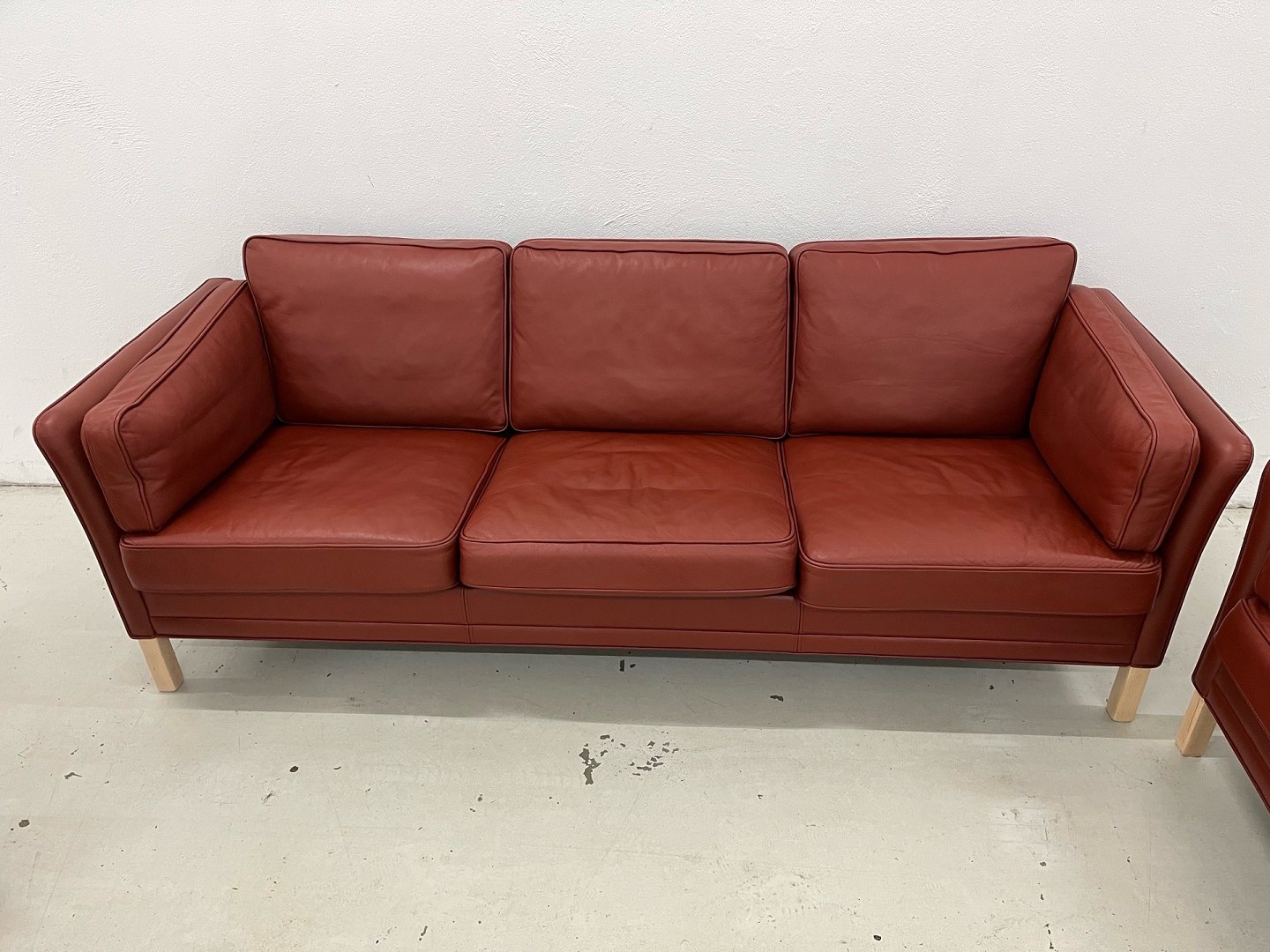Only used on special occasions, set consisting of MH2225 3- and 2.5-seater sofas and MH80 Queen's Chair, made of cognac-colored Gefion leather and with beech legs (40 x 40). New price: 106,217 kr.