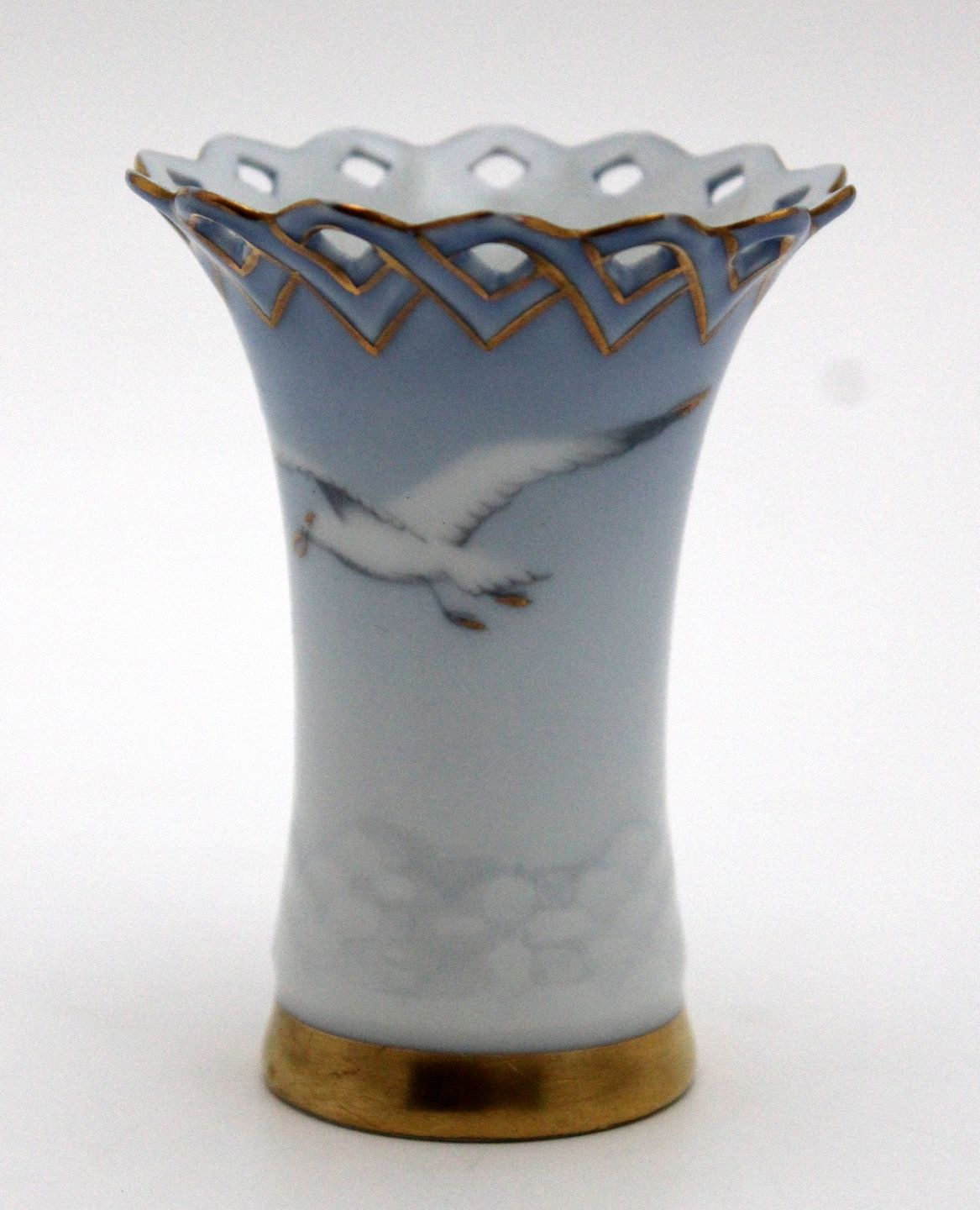 Text available in Danish: Kuvertvase med hulkant, Måge med guld, Bing & Grøndahl