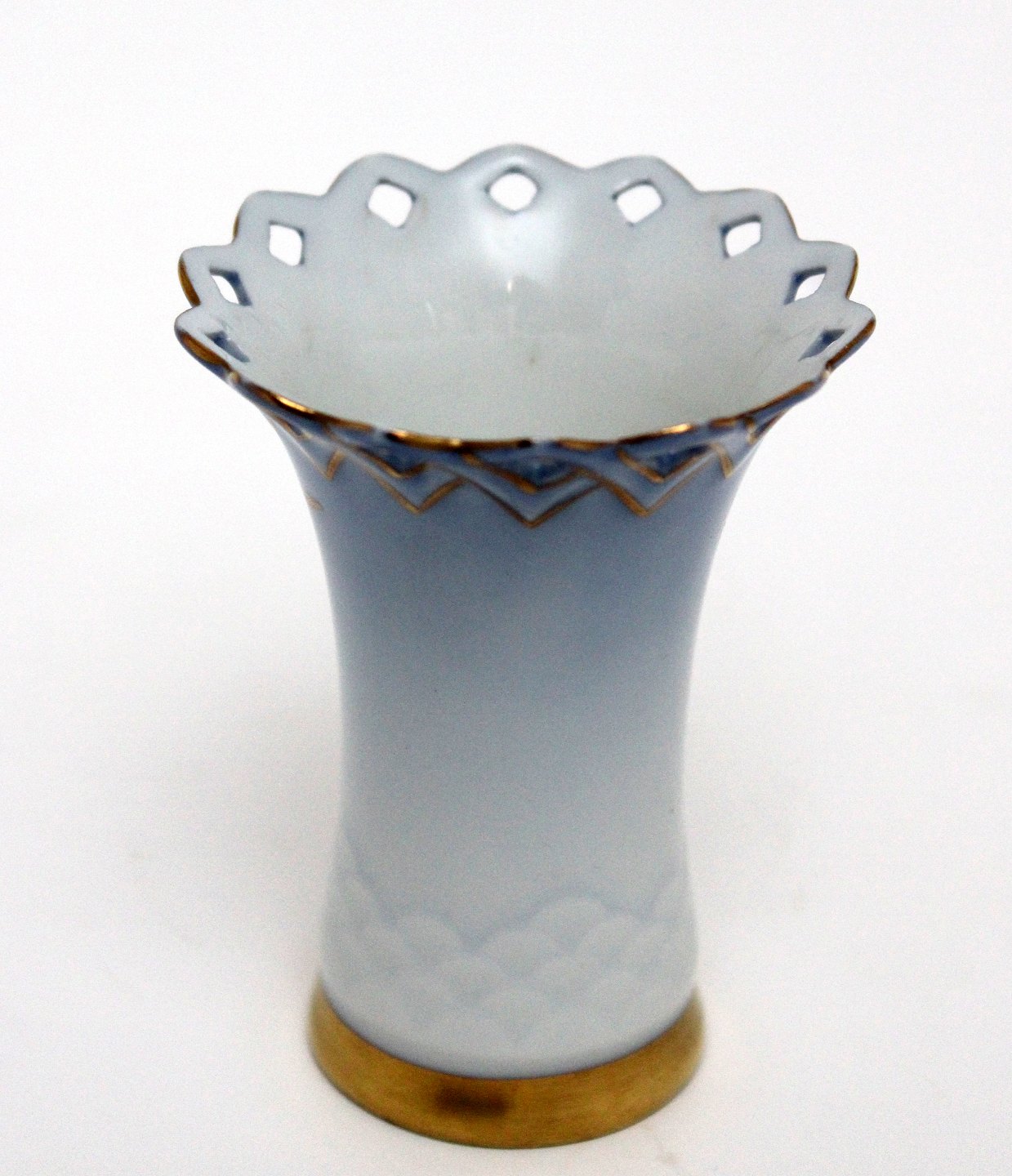 Text available in Danish: Bing & Grøndahl, Måge med guld, Kuvertvase med hulkant. Nr. 171. Højde 7,5 cm. Øverste diameter 6 cm. I. sortering. Pris: 175 kr. stk. Lager: 1